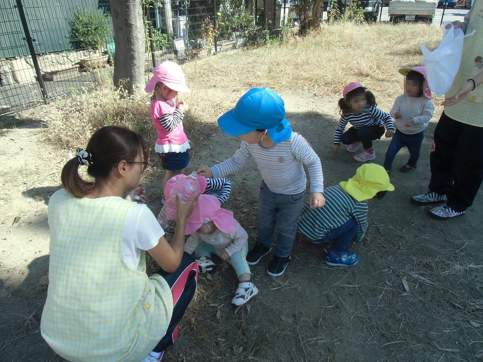 左下写真は公園での戸外遊びのついでに、ドングリ拾い(月曜日)。