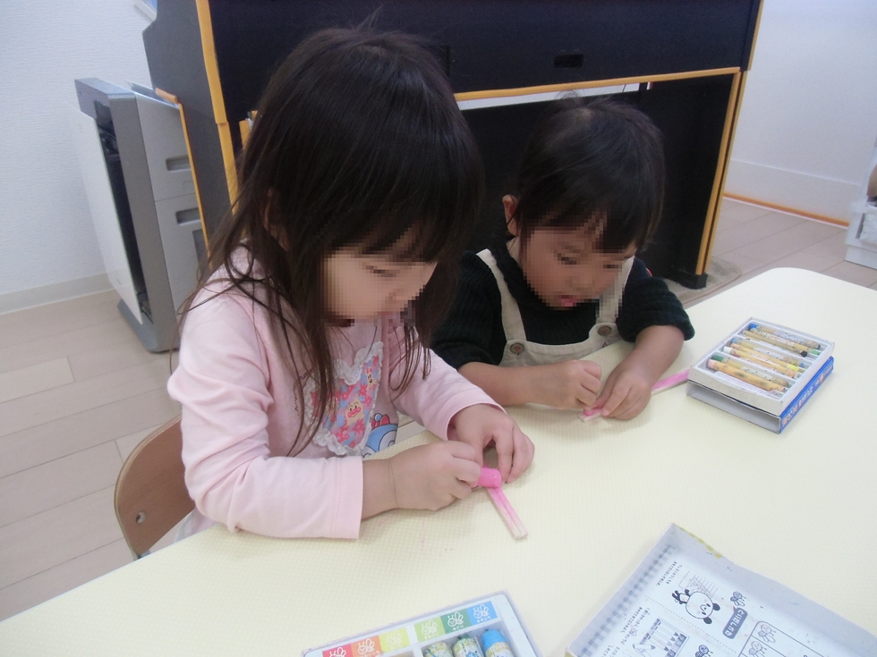自然工作の時間にヤクルトの空ビンと割り箸とドングリでマラカスを作ります(火曜日)。(右下写真)