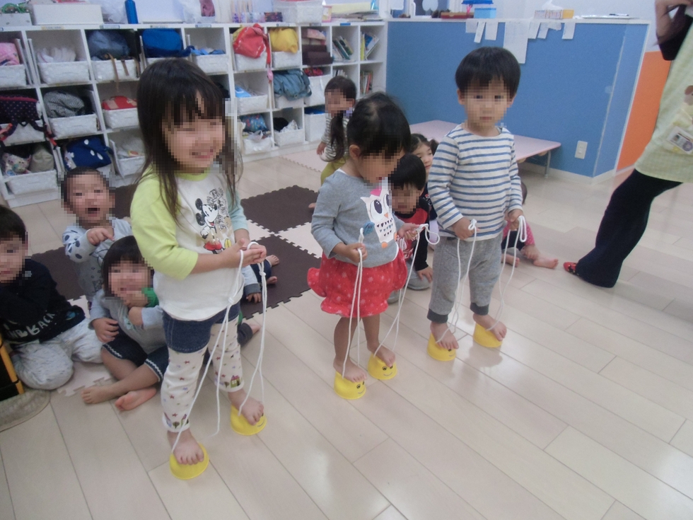 写真は初めてのパカポン。バランスよくパカパカと歩くのがけっこう難しいんです。さすが2才児さん(^-^)、しっかり乗れています。