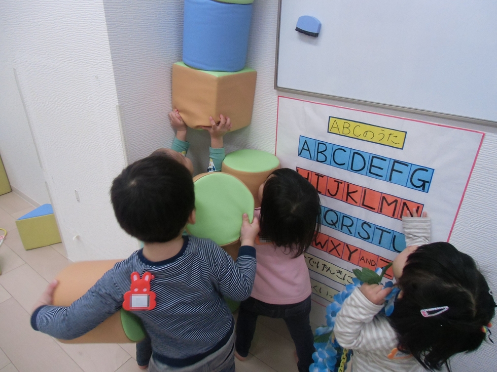 2才児と1才児子天使ちゃん3人で壁のコーナーに大型ソフトブロックを積み上げていました。高く高く積み上げたいのですが、身長が足りません。。。
