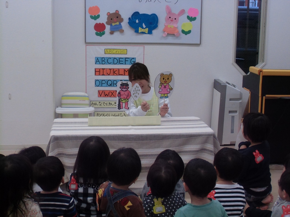 2番手はM2先生のペープサート「豆まき鬼退治」。来週は節分です(^-^)少しずつ節分への楽しみを盛り上げていきます。(左下写真)