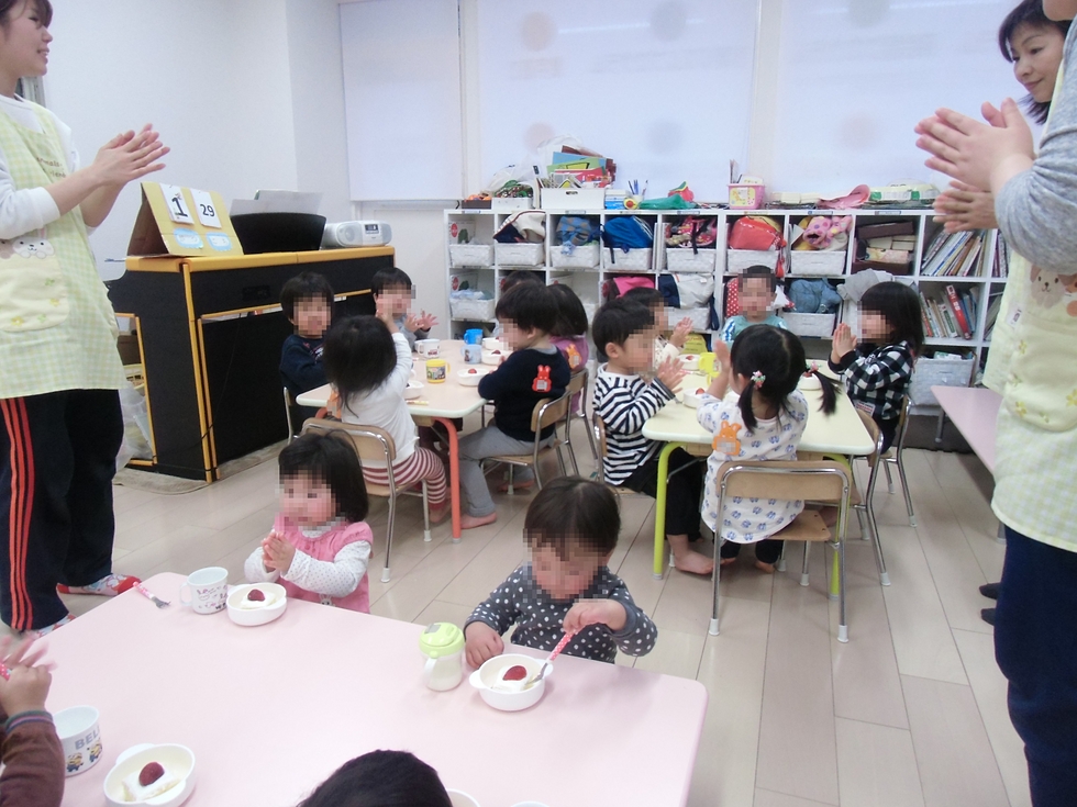子天使ちゃん達お楽しみ、給食士さん手作りのいちごのショートケーキでカンパーイ(右下写真)。