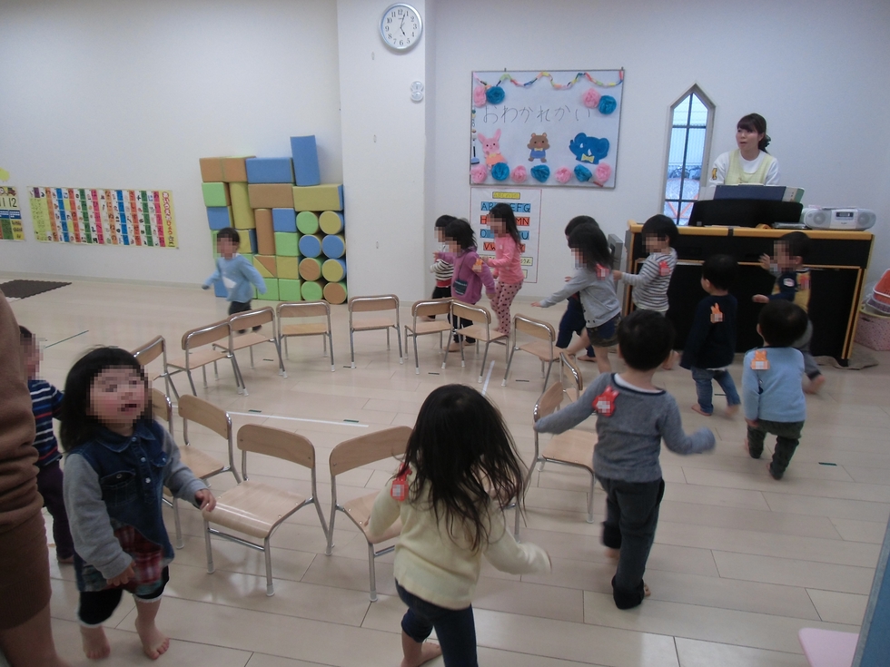 おやつの後は赤組さんのリクエストゲームでいす取りゲーム(^o^)。(右下写真)