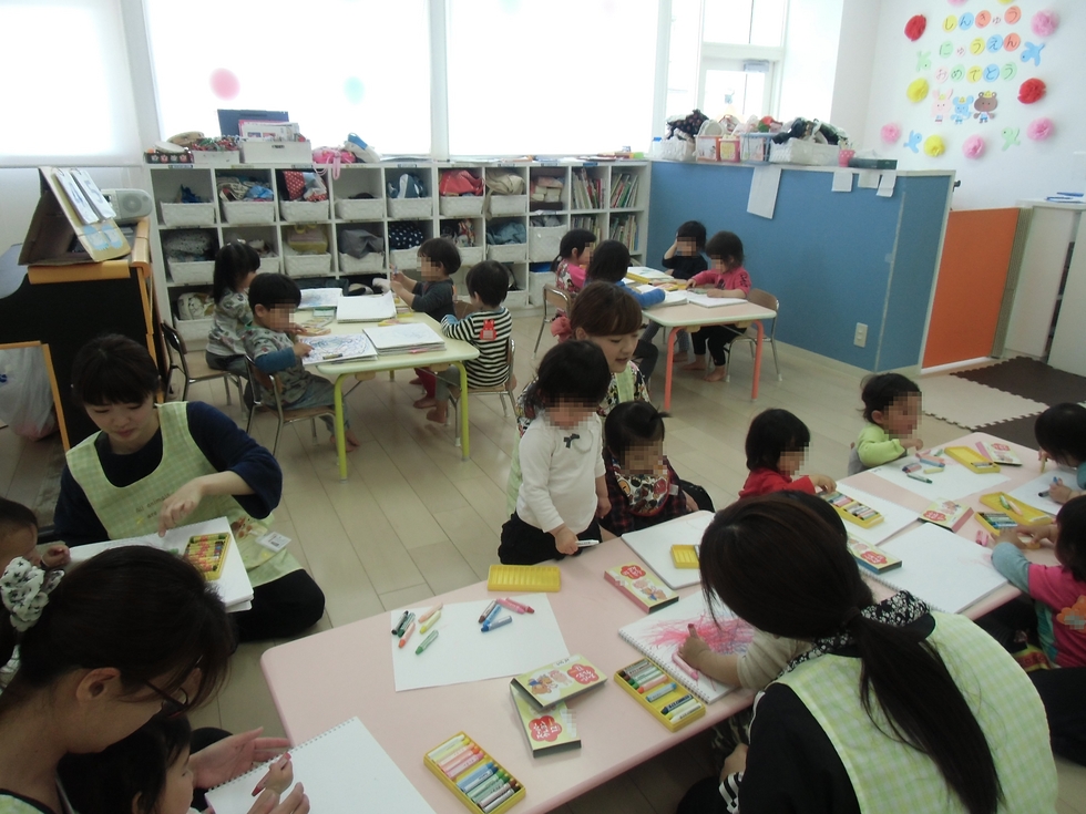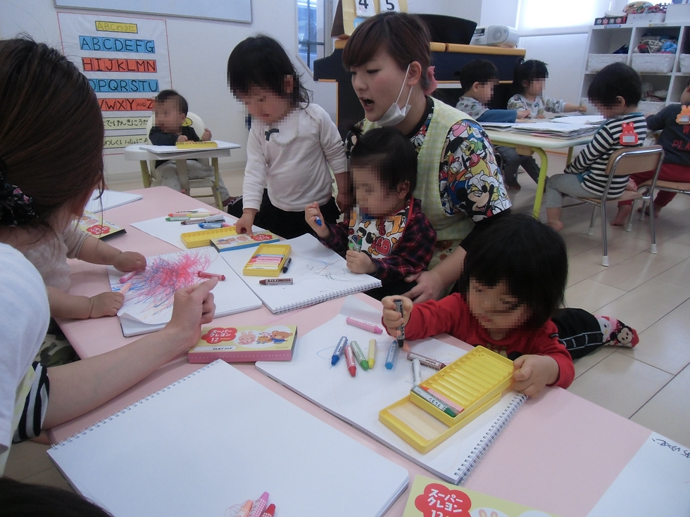 新入園児は慣らし保育3日目です。中には初めてクレヨンを使う子天使ちゃんもいます。(^-^)