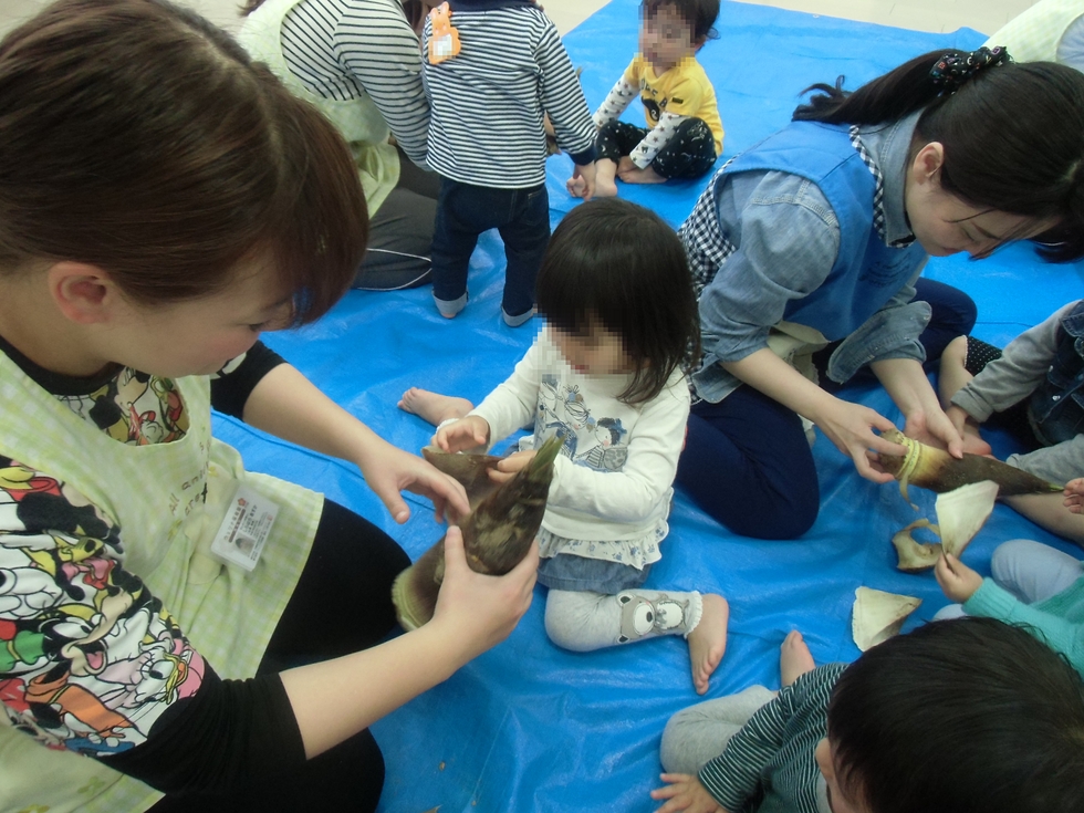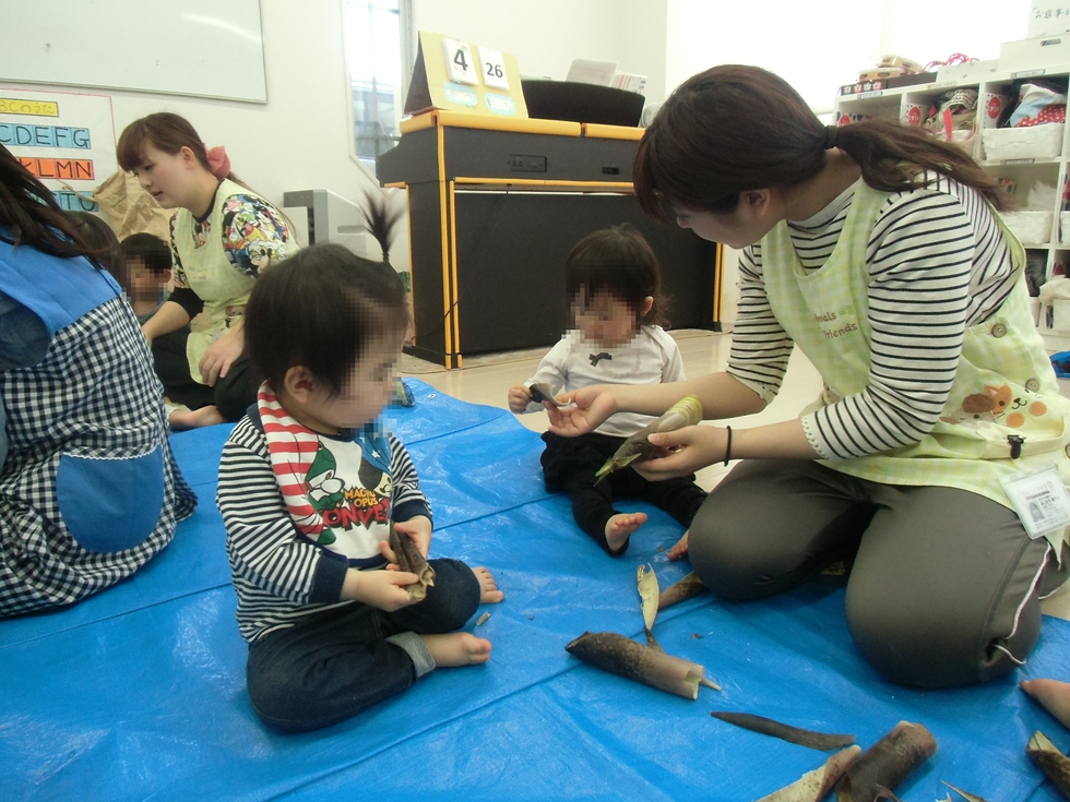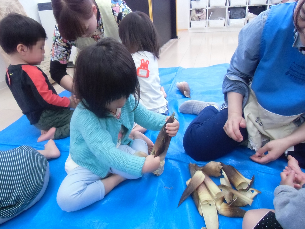 土の付いたたけのこを初めて見る子天使ちゃんも・・初めての子天使ちゃん達はなぜかたけのこを怖がっています(笑)、大きな毛虫に見えるのかな〜