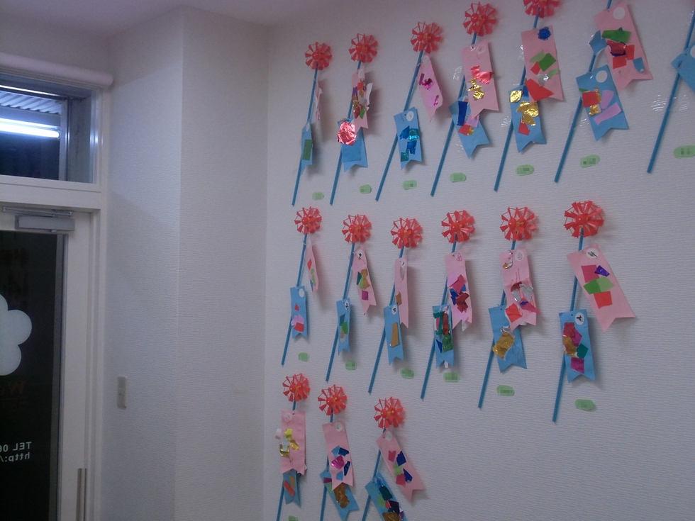 出来上がったこいのぼりはエントランスに飾りました。(右下写真)