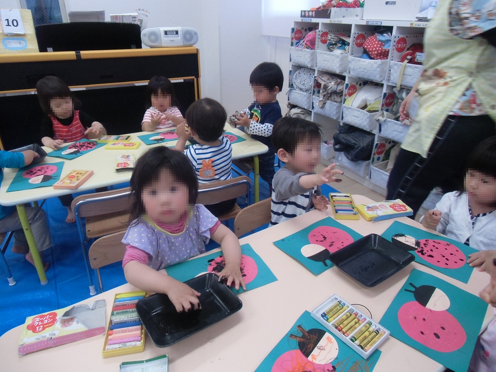 てんとう虫のお顔を描いて〜(^-^)(左下写真)。指に黒絵具をつけて、てんとう虫の背中に星をぺったんこ・ぺったんこ〜(^-^)(写真)。みんなスゴイ集中力!