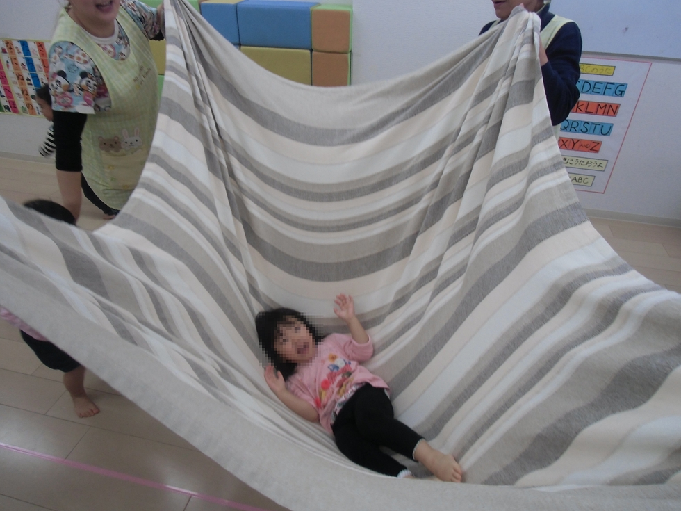 工作絵画の後は「魔法の絨毯遊び」です。たのしそーう(^o^)(右下写真)。