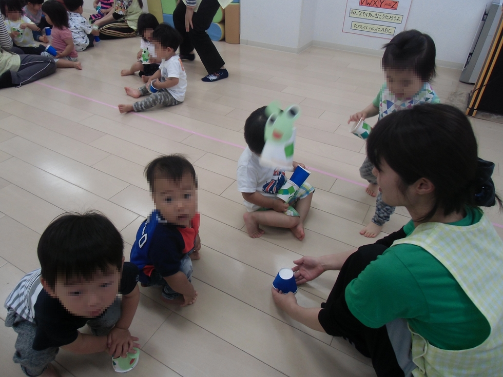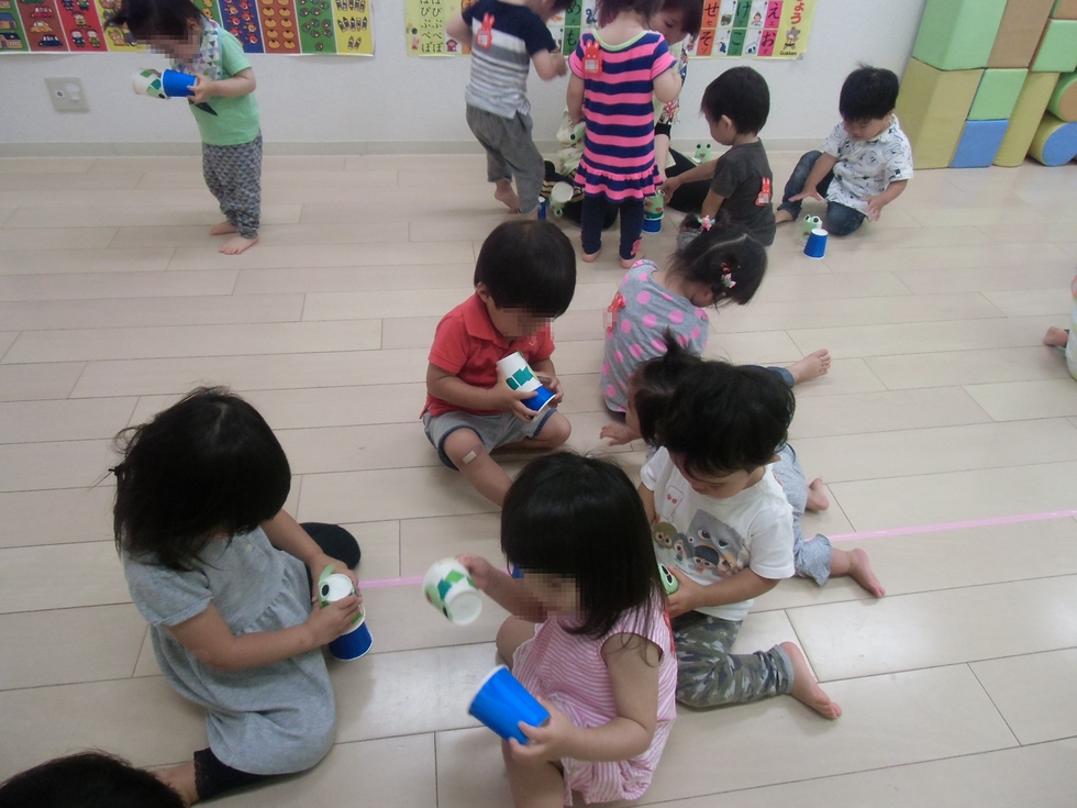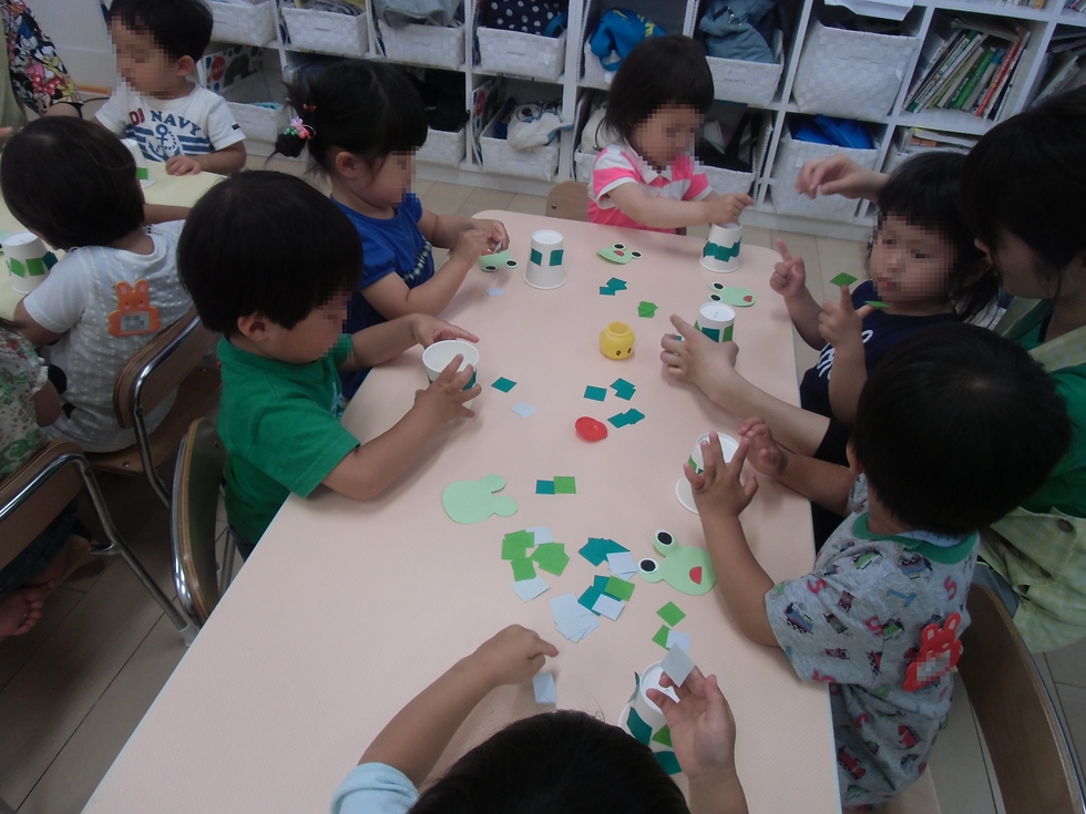 昨日は折り紙、紙コップ、輪ゴムを使って『ジャンピング蛙』を作りました。(写真)