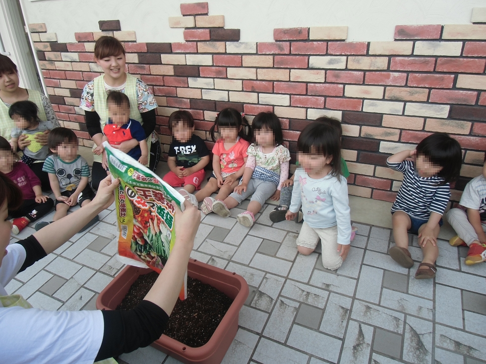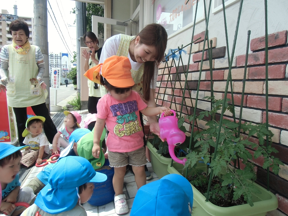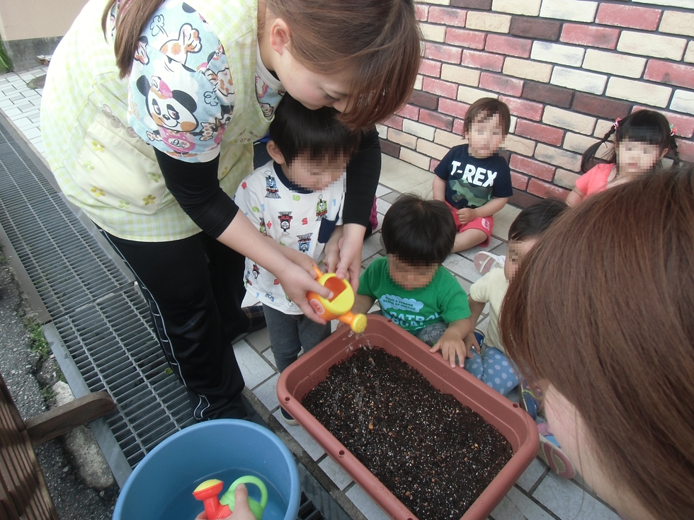 毎日のお外遊びの前に、子天使ちゃん達は交代でお水をやってくれています。(写真)「早く、大きくなぁれ〜♪」(^o^)