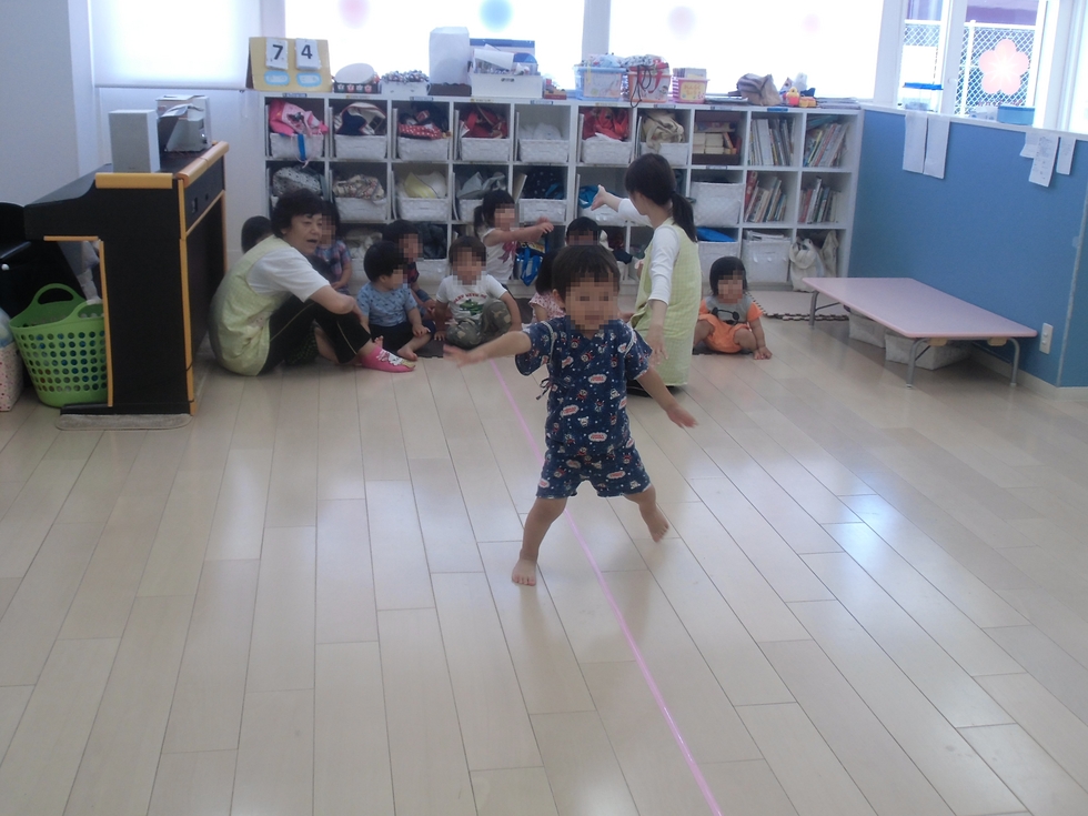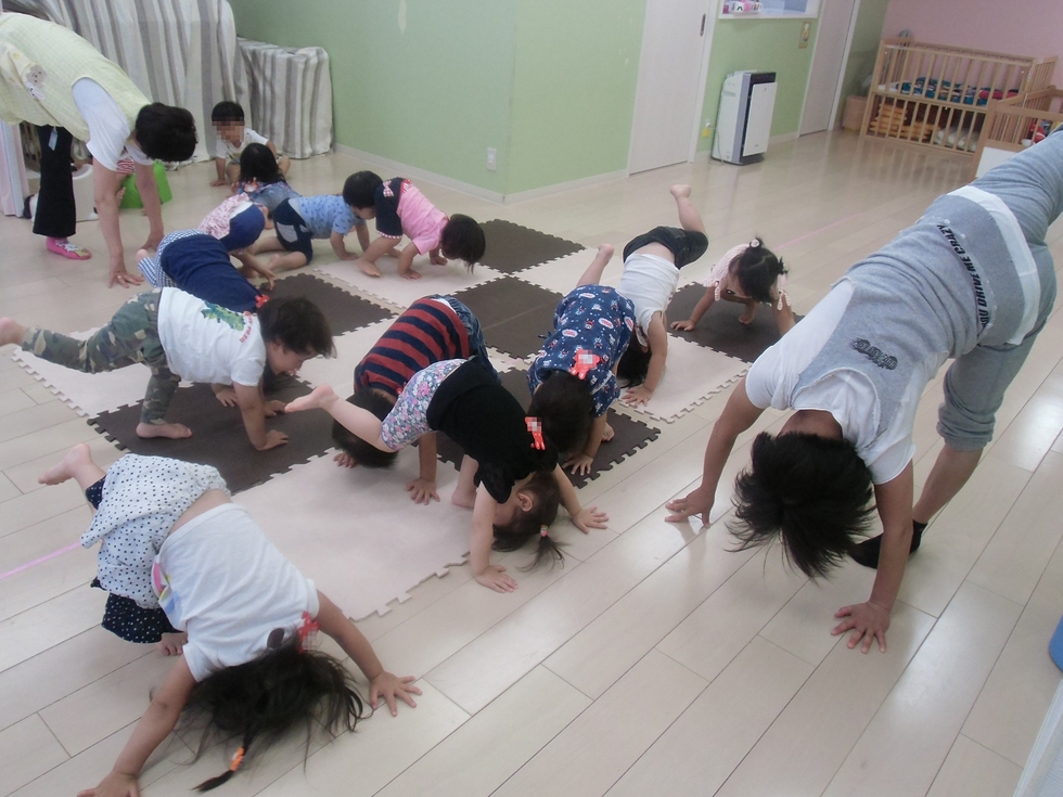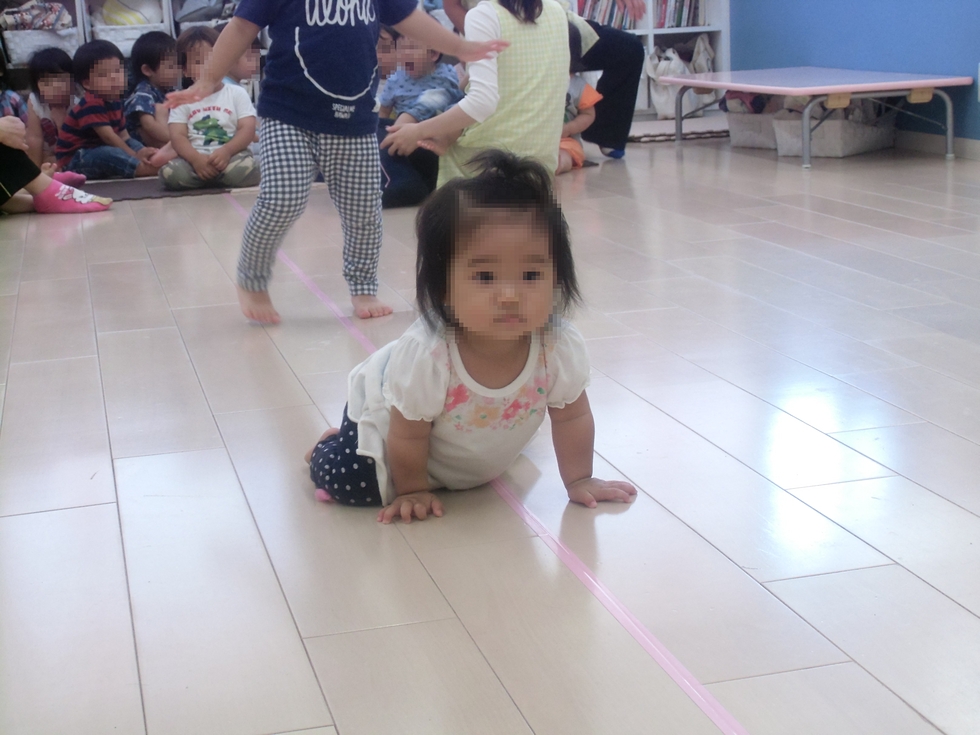 写真はY先生の真似をして難しい動きに挑戦する子天使ちゃん達(^-^)頑張っています。下の写真は音楽に合わせてリズミカルに線の上を歩きます。0才子天使ちゃんもハイハイで参加しています(^o^)。(右下写真)
