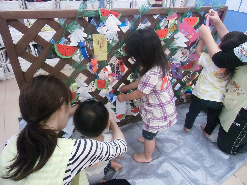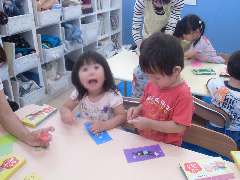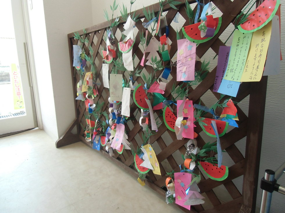 先週に続き今週の工作も七夕制作をしました。今週は短冊にお願い事?(笑)を書いて、自分たちで笹に飾ります(^-^)。(写真)
