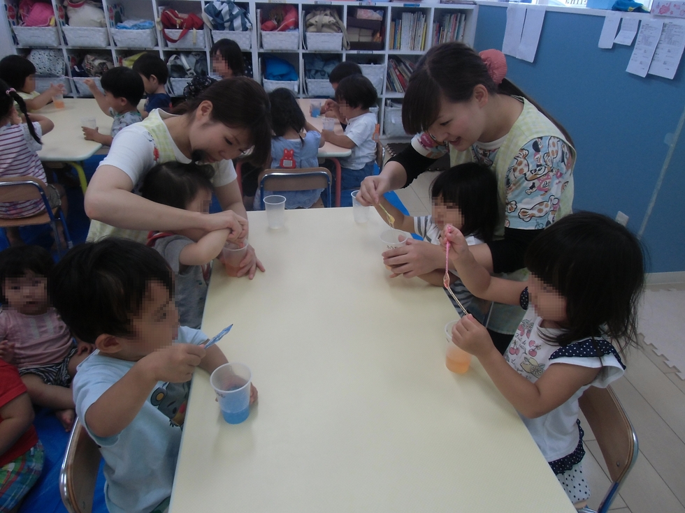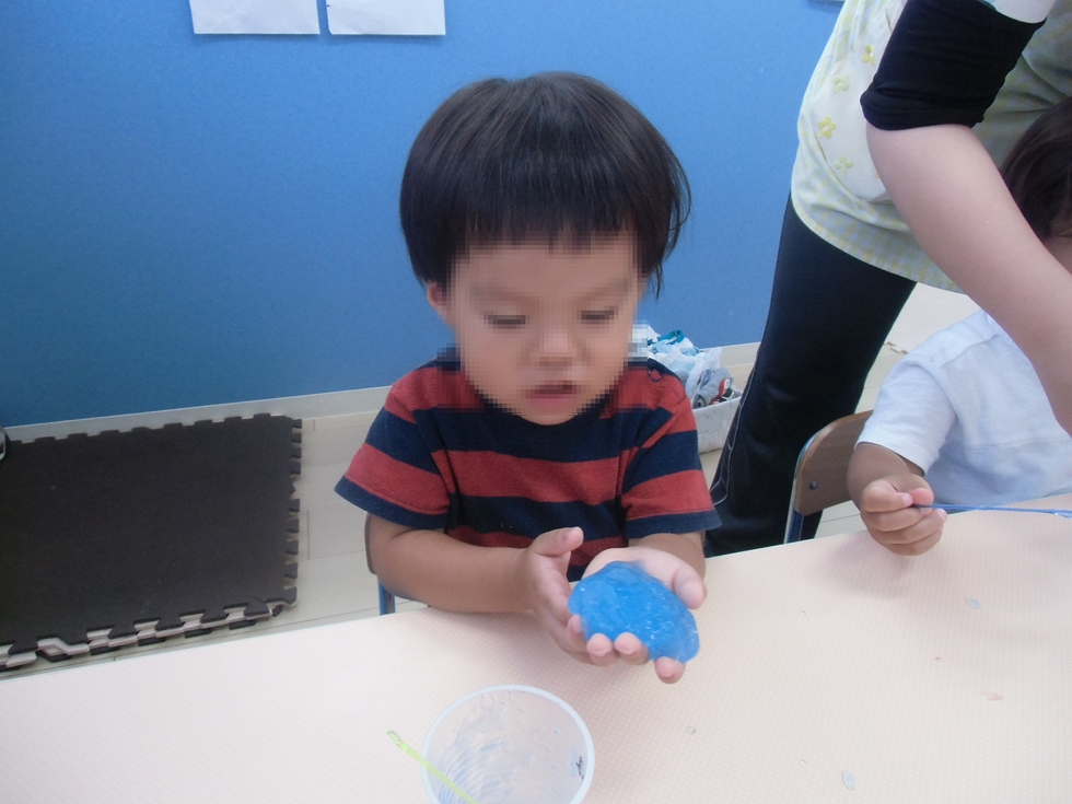 今日の工作は暑い季節の人気工作「スライム作り」をしました(^-^)。〈洗濯のり〉に〈ホウ砂〉を加えて〈水〉をたして『まぜまぜまぜまぜ〜♪』