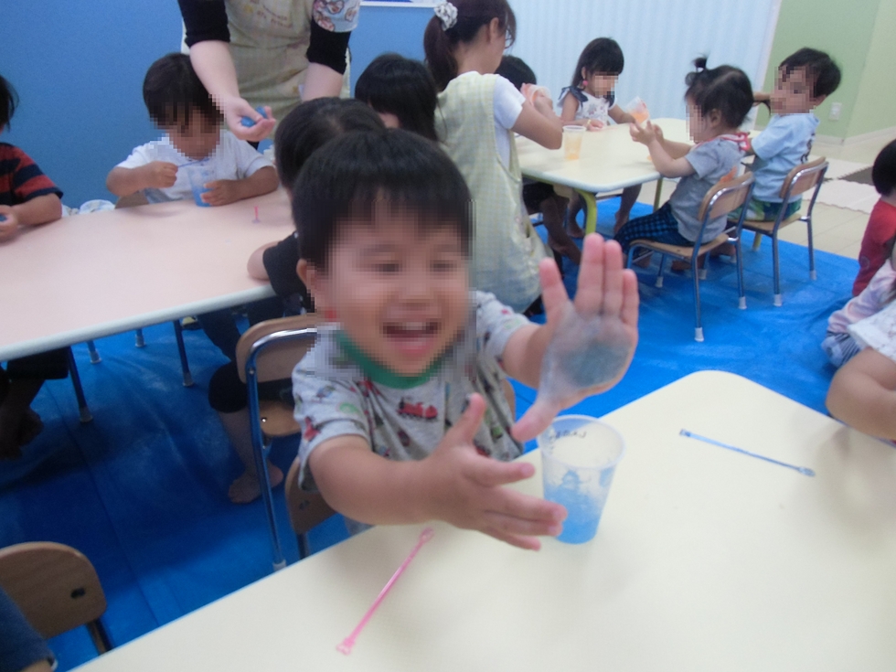 完成したスライムで遊びます。ベトベトヌメヌメ、冷たくて気持ちいいね(^-^)。自分で作ったスライムで遊ぶ子天使ちゃん達、大興奮で大喜び!(^o^)