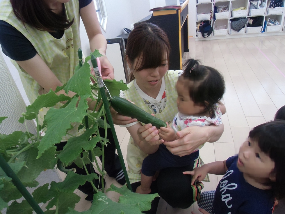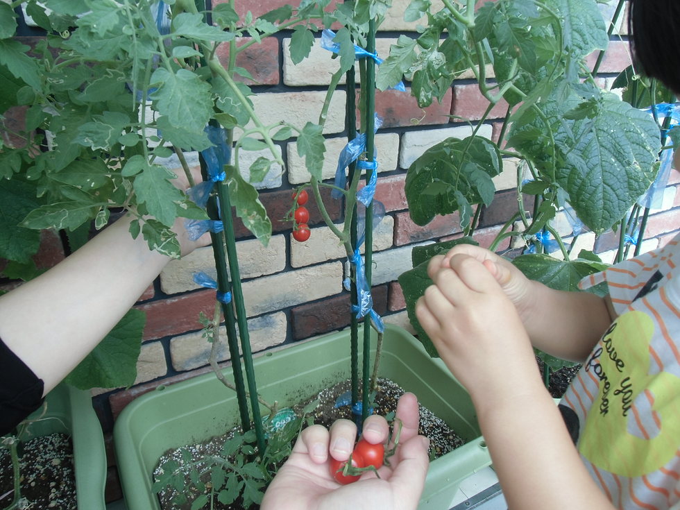 下の写真は子天使ちゃん達が育てたキュウリとトマトの刈り入れです。