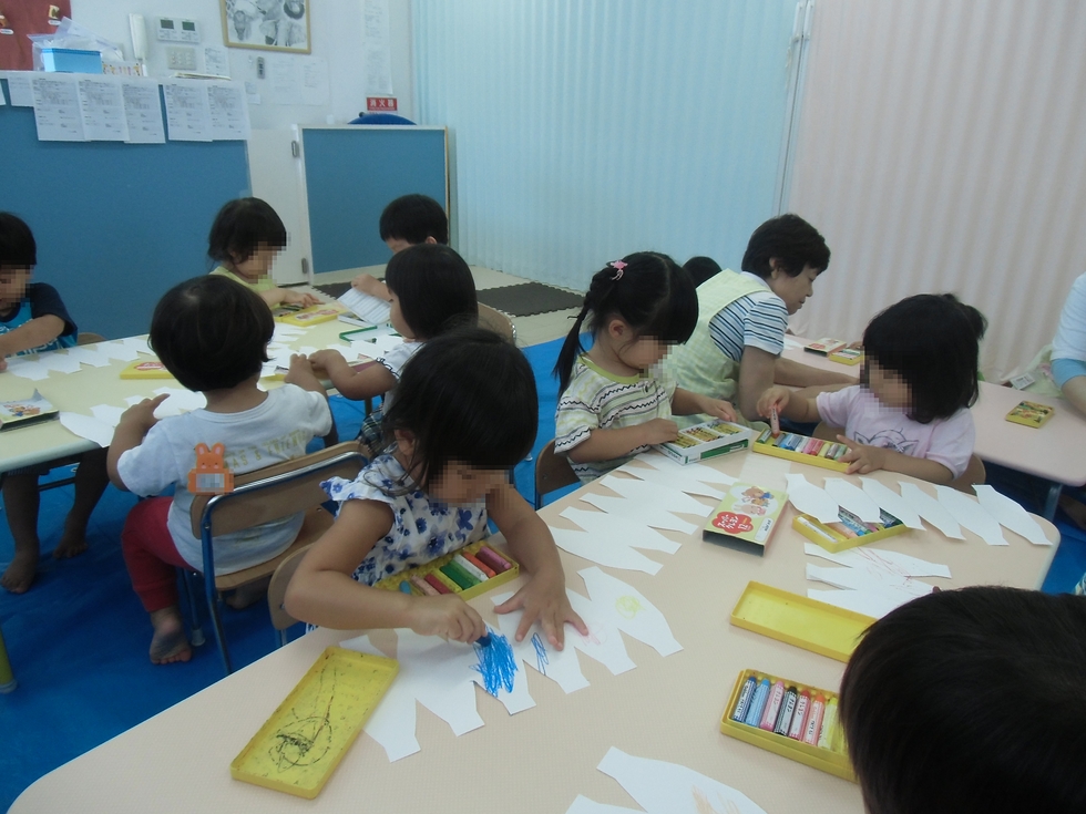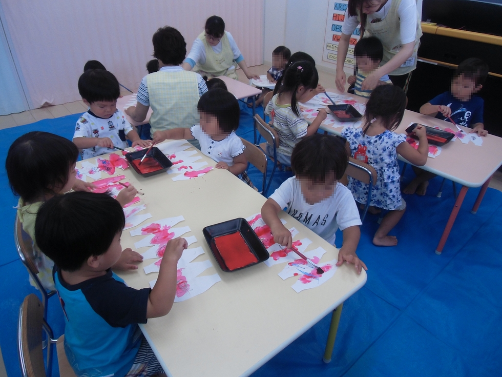 4日の木曜日は6日(土)に行う「夏祭りの」飾りつけのひとつ『提灯』を作りました。下地にクレヨンで模様を描き、そのあとで赤色絵具を塗ります。クレヨンが絵具をはじいて、いい模様の提灯絵柄が出来上がります(^-^)。子天使ちゃん達、真剣に取り組んでいます(^-^)。