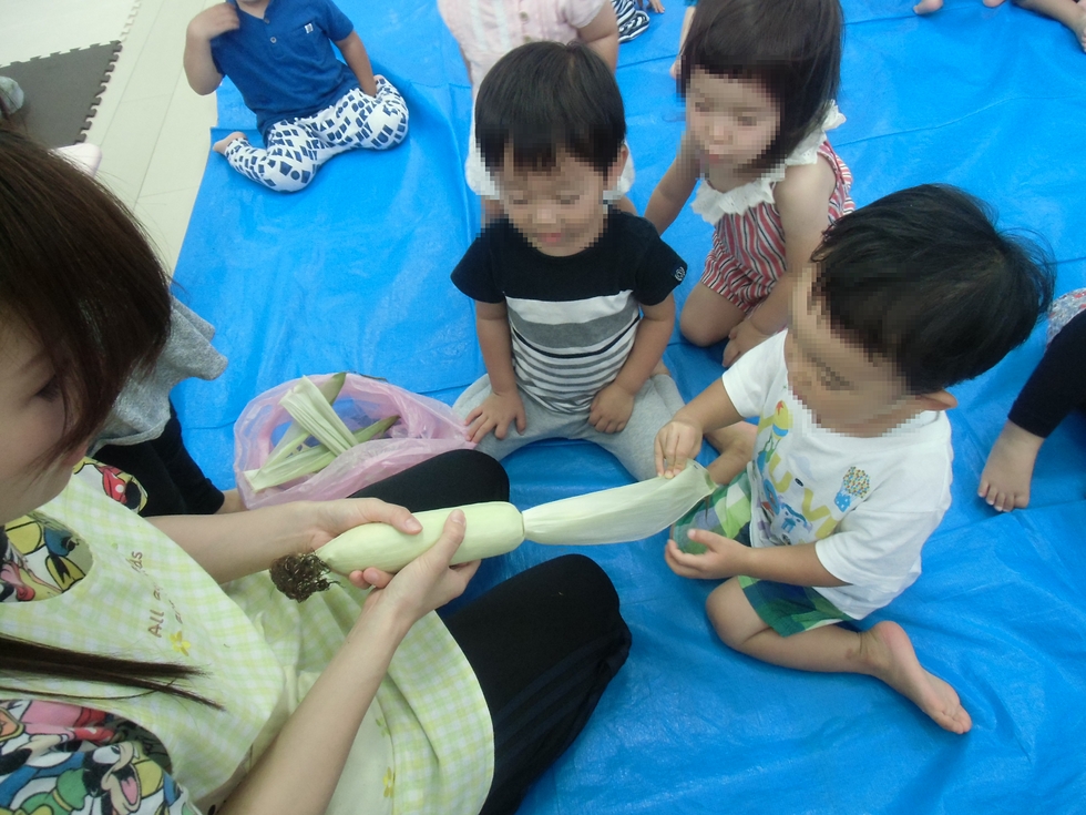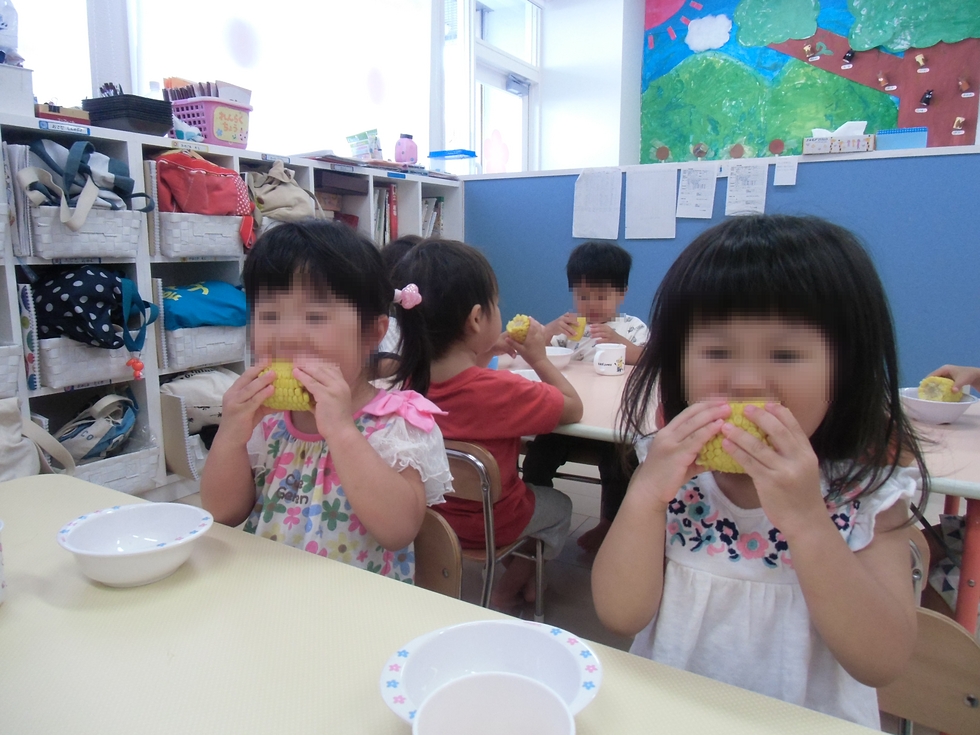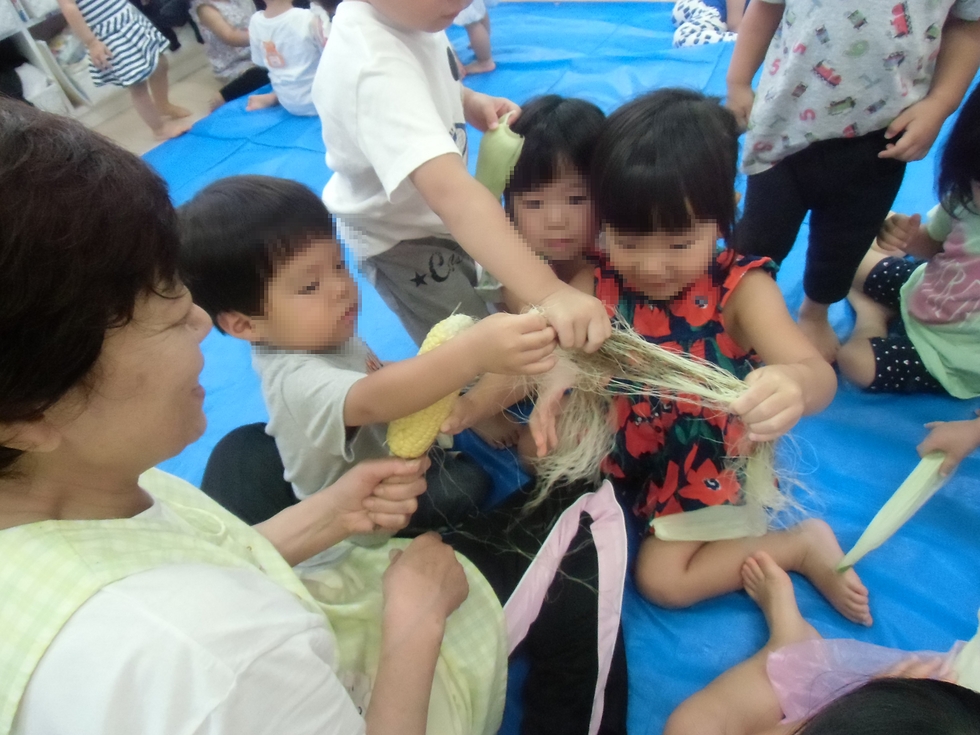 5日の金曜日のおやつは、頂き物のトウモロコシが沢山あったので茹でトウモロコシです。調理の前に子天使ちゃん達で皮むきをしました。(下の写真)「うんしょ〜、こらしょ〜」力を入れて皮をむきます(^-^)。