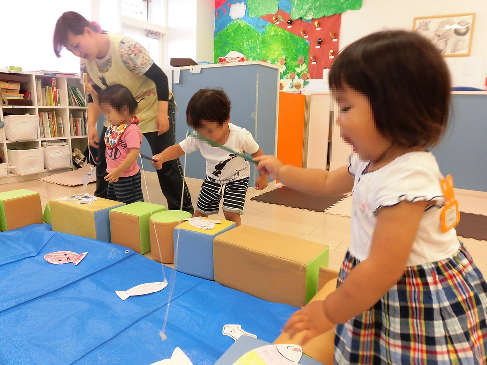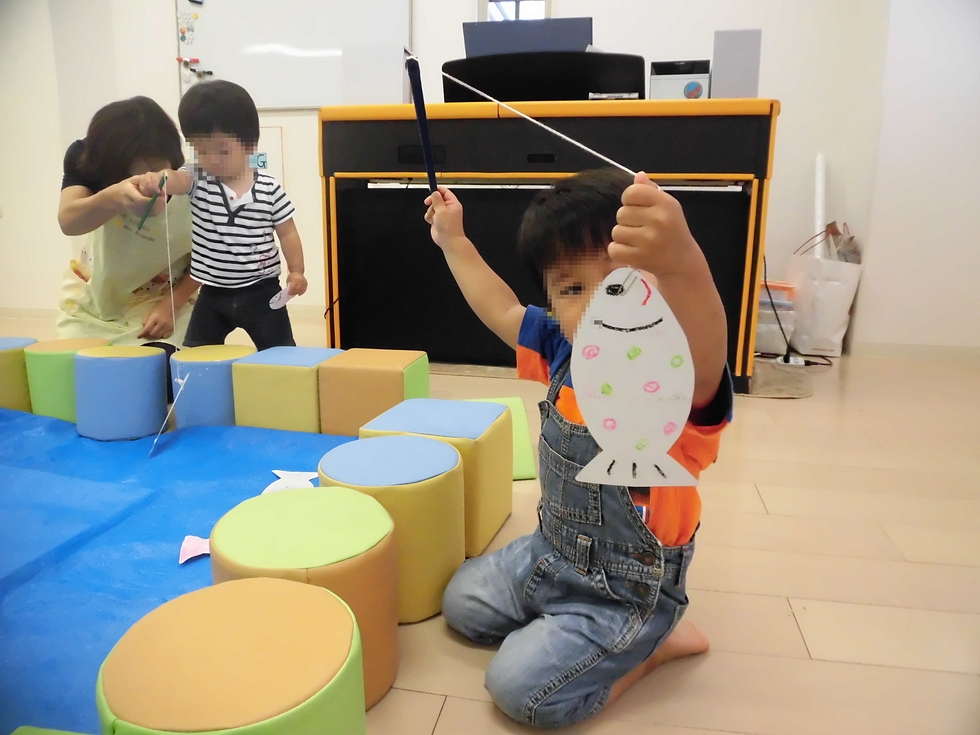 午後は自分たちで作った魚を使って魚釣りゲーム(^-^)。磁石のついた釣り竿を使って・・子天使ちゃん達は真剣です。釣った魚を皆で数えます「一匹〜、二匹〜、三匹〜・・」(^o^)。