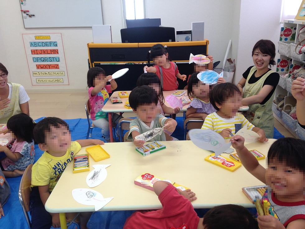 水曜の朝の設定保育は魚を作りました。クレヨンで好きな色を塗ったり、お絵かきしたり(^-^)。