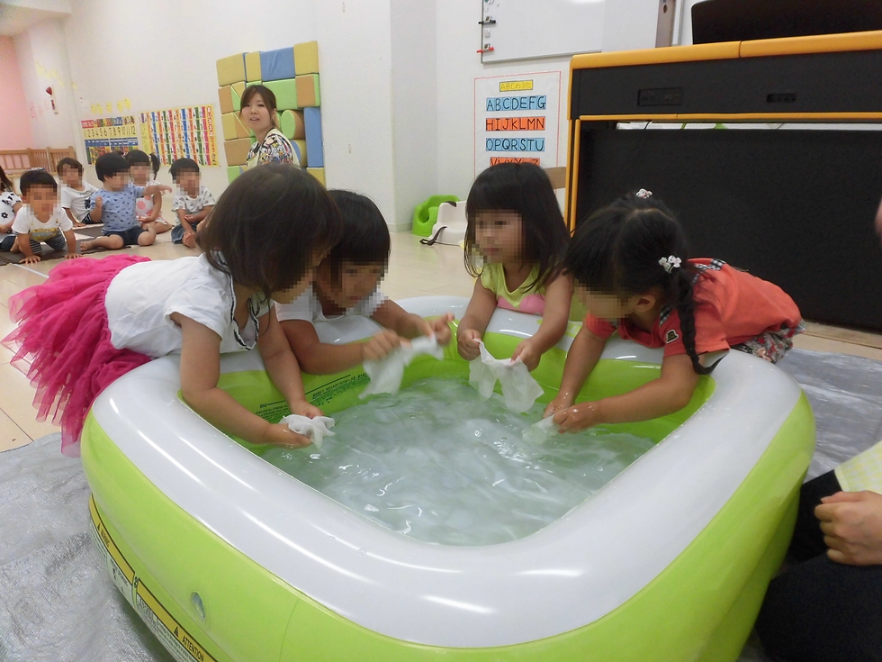 汚れたシャツを渡された子天使ちゃん達、お水につけて洗います〈ゴシゴシシャカシャカ〉力を入れて洗います(^-^)。