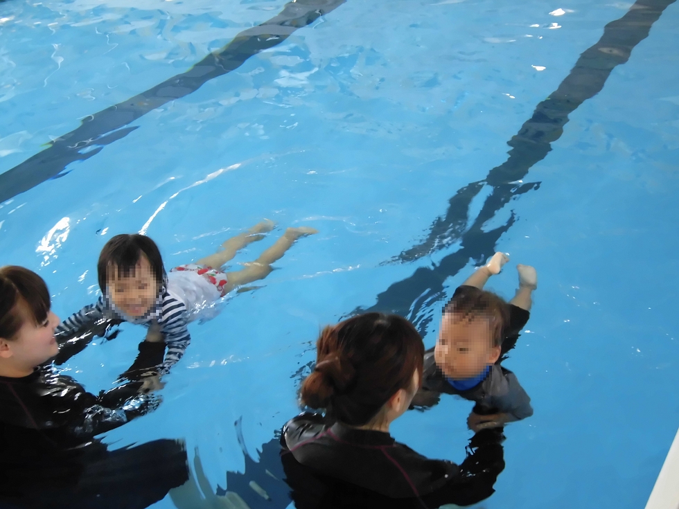 2才児子天使ちゃんはスイミングスクールのコーチと、0・1才児子天使ちゃんはWelinaの先生と、大きなプールで水に慣れ親しみます。