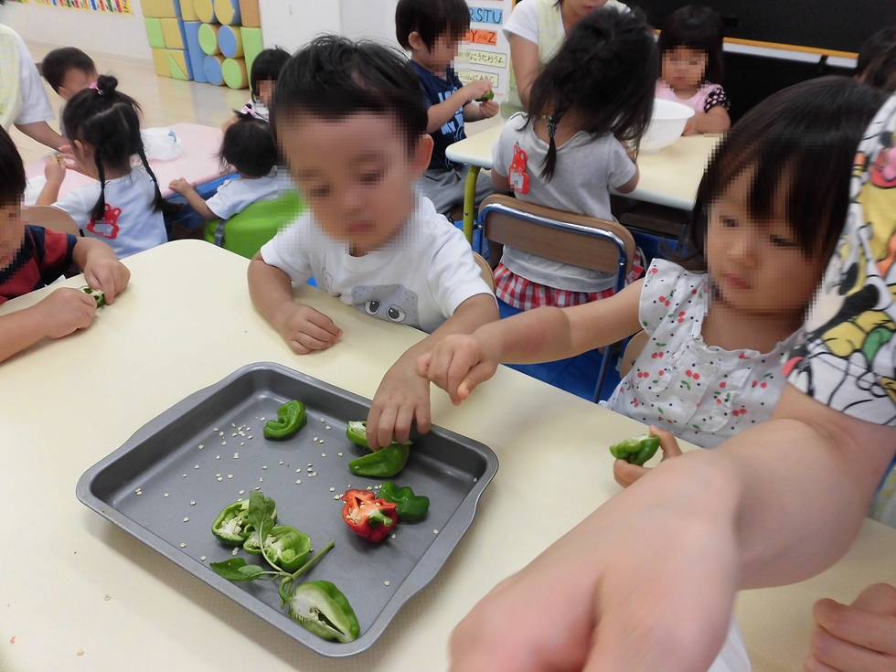 頂き物のピーマンがたくさんあったので、ピーマンの種取りをしました。子天使ちゃん達、集中してピーマンに向かい合っています(^-^)。