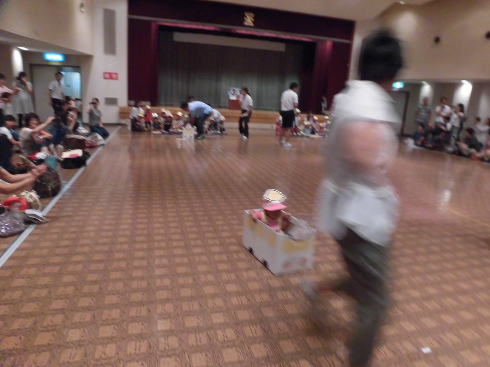 次の競技はお父さんお母さんにもご参加頂いての「親子競技:我が子はどこかなヒヨコ捜し」(左下写真)です。お父さんお母さん早い早い!親鳥バスにヒヨコ(我が子)を乗せて走ります!(^o^)