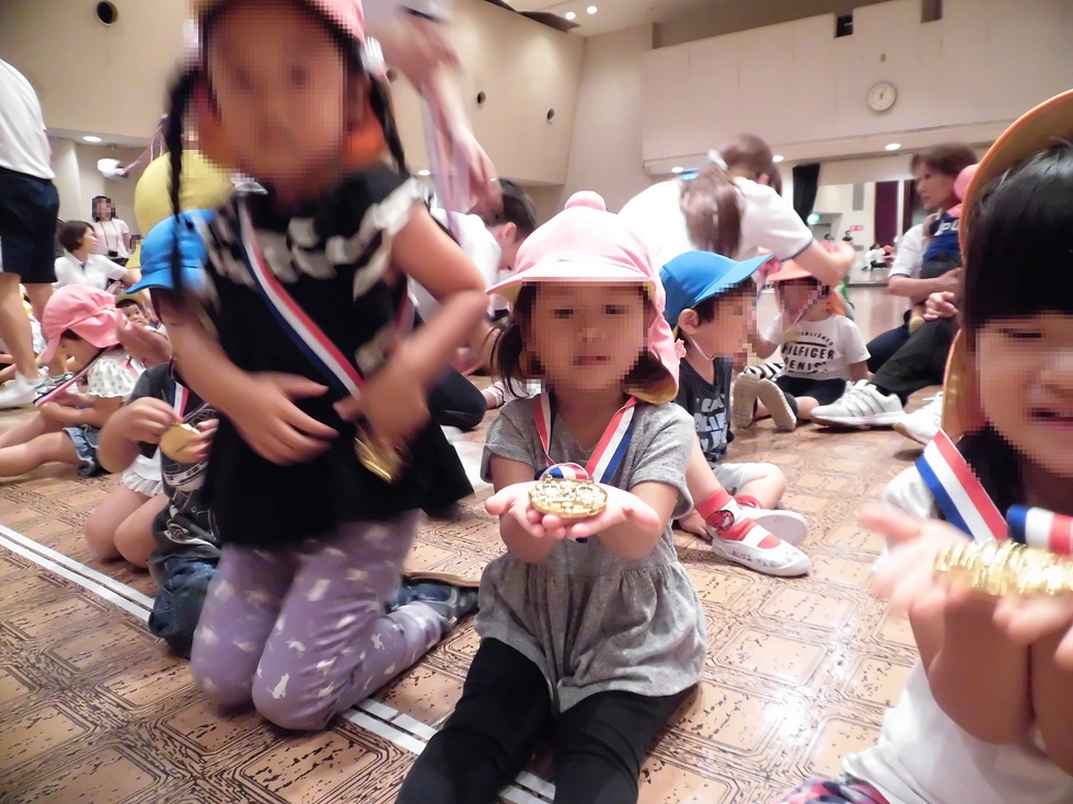 勝った白組も頑張った紅組も先生から《Welina金メダル》を首からかけてもらいます。子天使ちゃん達、どこか誇らしげです(^-^)。(写真)