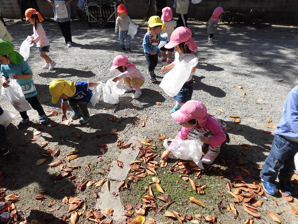 24日・月曜のお外遊びは塚口神社参道に落葉拾いに行きました。