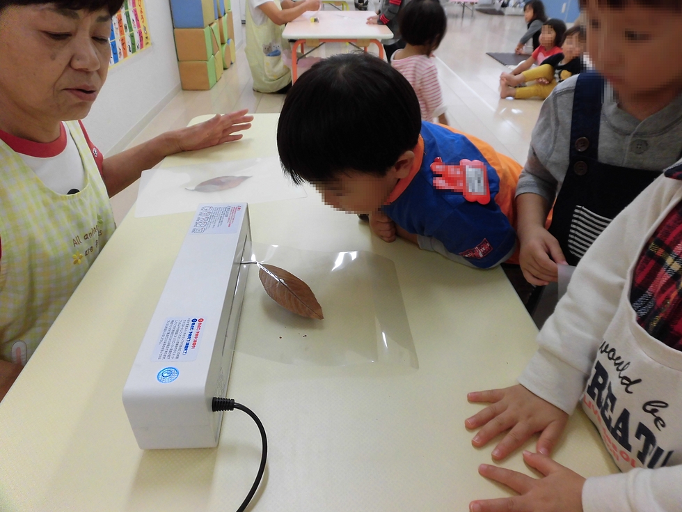 BMI先生は受け取った落葉入りフィルムをラミネートしてくれます。(右下写真)