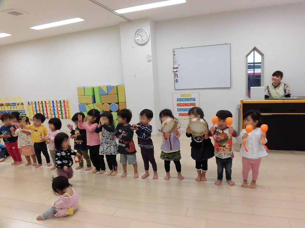 写真は音楽リズムP、カスタネット・ハンドベル・タンバリン・マラカスで先生のピアノに合わせて「シャカシャカ〜、タンタン、リンリン、タムタム♪」(^-^)。