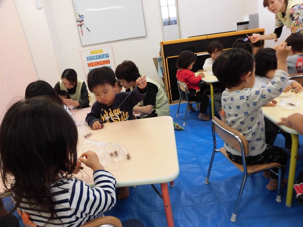 子天使ちゃん達が前日に公園で拾い集めたどんぐりを使います。夜の間に先生達でどんぐりに穴を空けました。