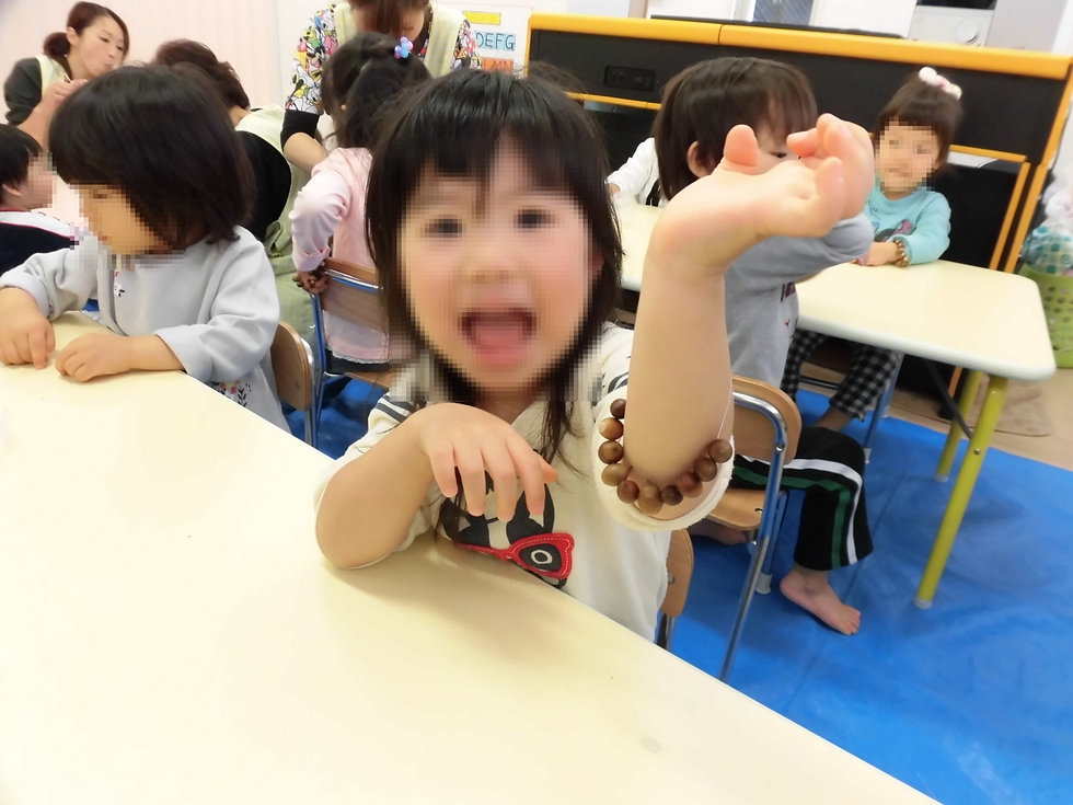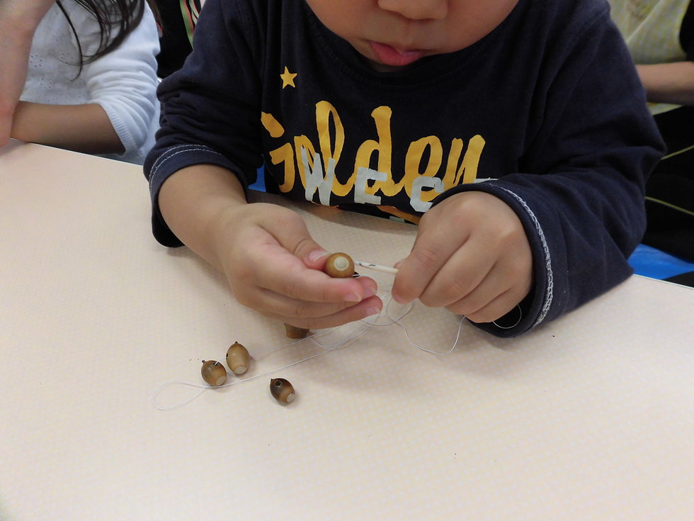 秋は工作の材料になるものが沢山あります(^-^)。今週の自然工作の時間は「どんぐりブレスレット」を作りました。