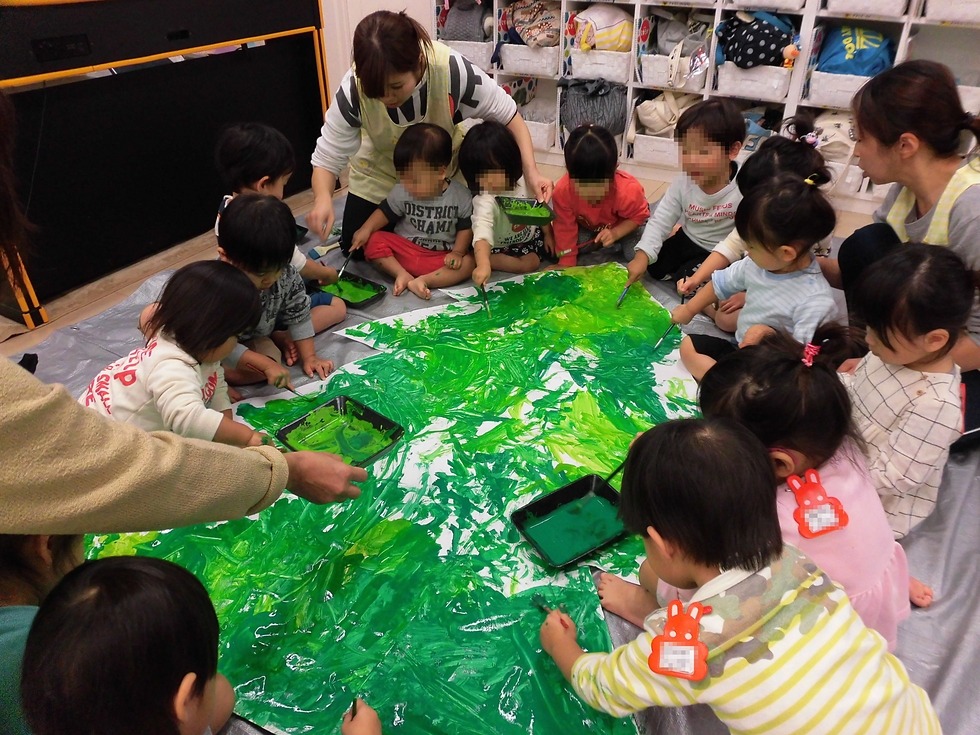 白い大きな模造紙に絵具で色を塗るところから始めます。みんなでヌリヌリ楽しいね〜(^-^)。Kくん、絵具でお鼻が緑色になっちゃってるよ(^o^)。