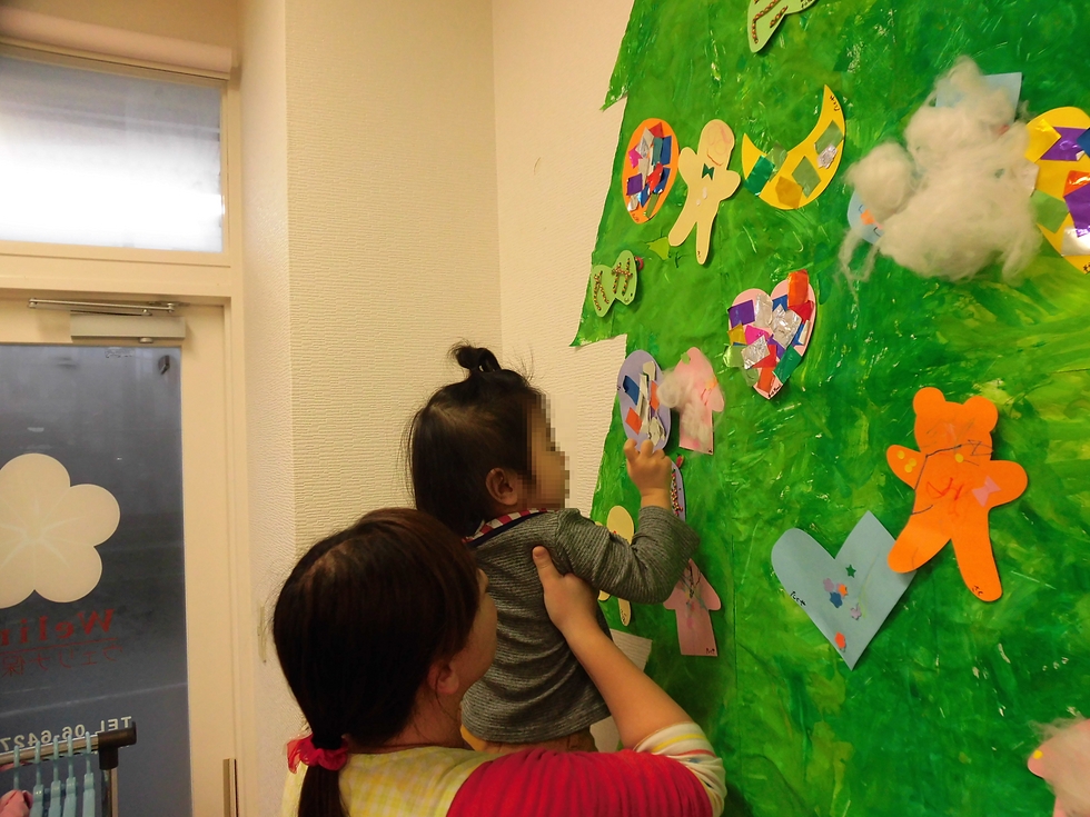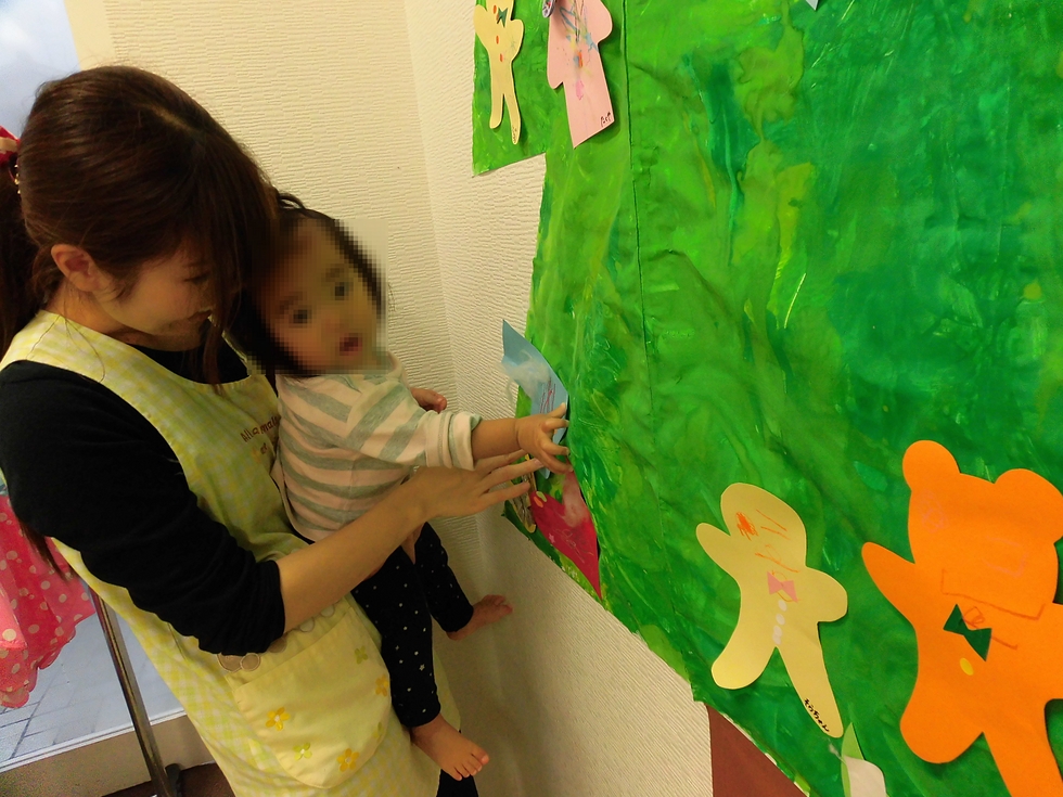 子天使ちゃん達は自分で作った飾りを、思い思いの場所に自分で貼り付け飾ります。届かないところは先生に抱っこしてもらって(^-^)。