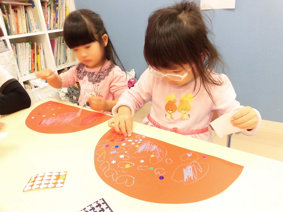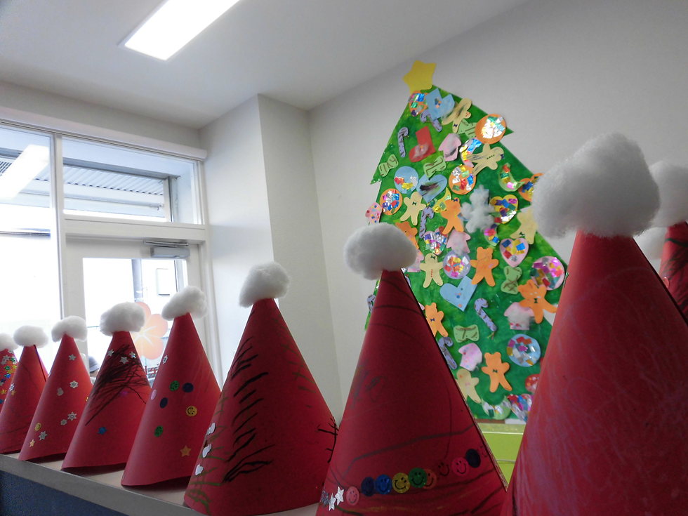 20日火曜日は工作はクリスマスパーティで被るお帽子を作りました。(下の写真)半月型の色画用紙に描いたり貼ったり頑張りました(^-^)。