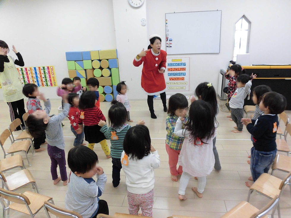 21日水曜日の英会話、ECC幼児教育講師は可愛いサンタさんの姿で登場です(^-^)。子天使ちゃん達、ウキウキとレッスンに取り組んでいました(^-^)。