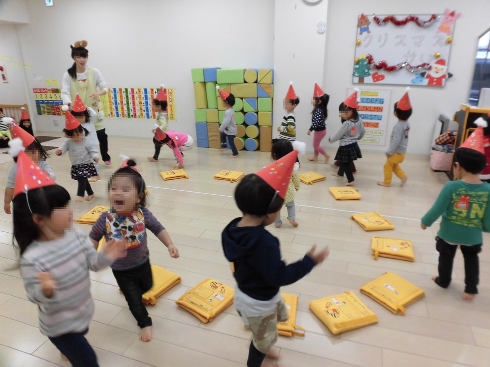 座布団取りゲームで子天使ちゃん達が悔し泣きしたり、喜んだりしているところにサンタクロースの登場です!
