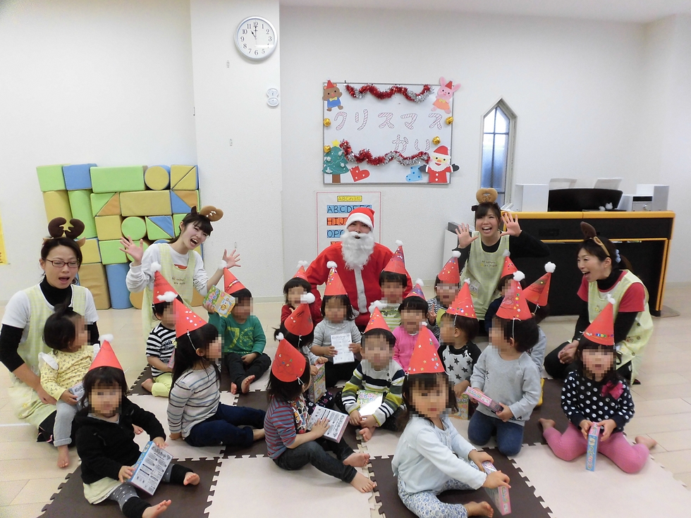 一人ずつサンタさんから直接プレゼントをもらったら、サンタさんと一緒に集合写真(^-^)。(何人かの子天使ちゃん、写真を撮る時もサンタさんが気になって仕方がないみたい・笑)