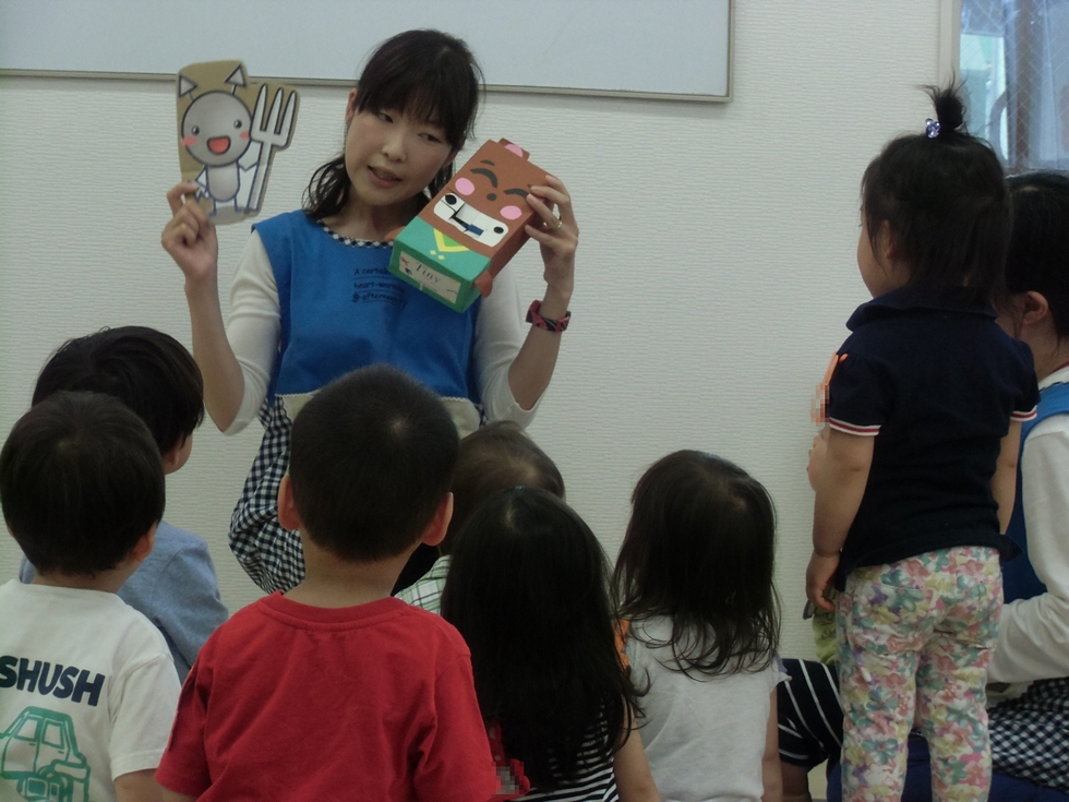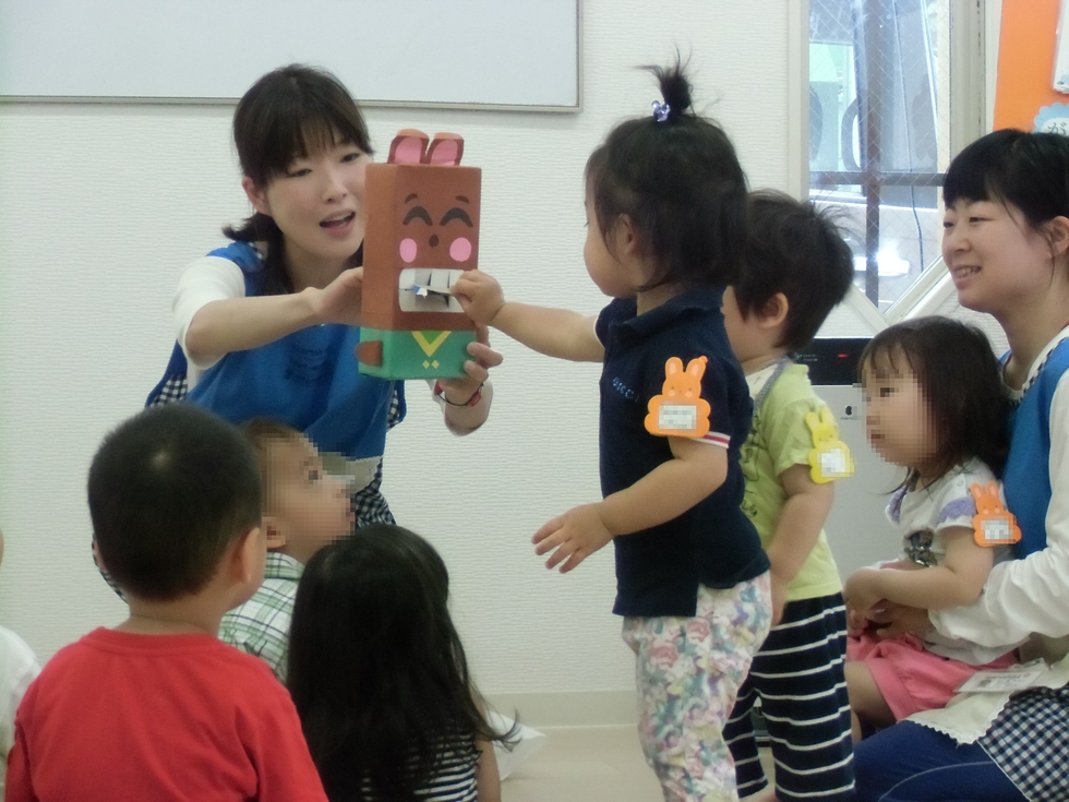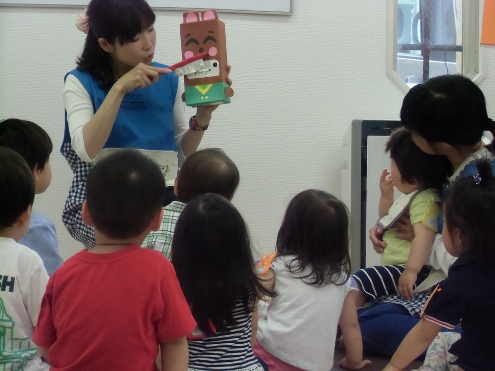 朝の設定保育はムシ歯について学びますくまさんにエサをあげましょう(左下写真)くまさん食事がすんだらムシ歯菌が登場〜(右下写真)歯ブラシ、ゴシゴシ、ムシ歯菌をやっけろ!(^0^)