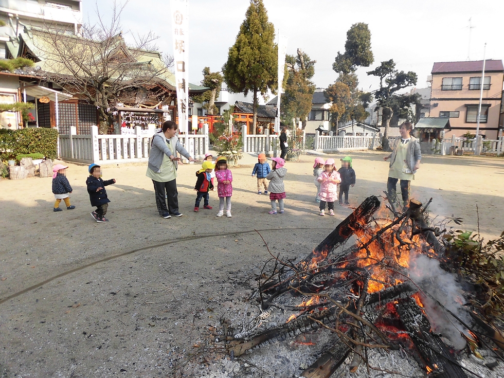 参拝がすんだら大きな焚火にあたりました。子天使ちゃん達は恐る恐る焚火にあたっていましたよ(笑)。