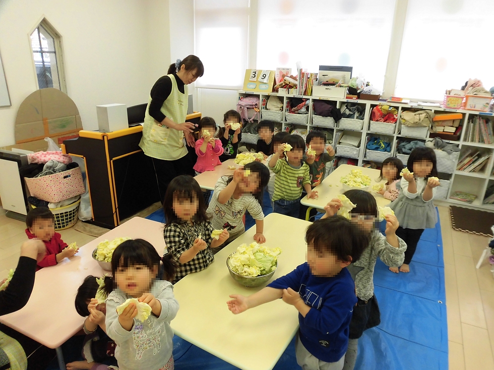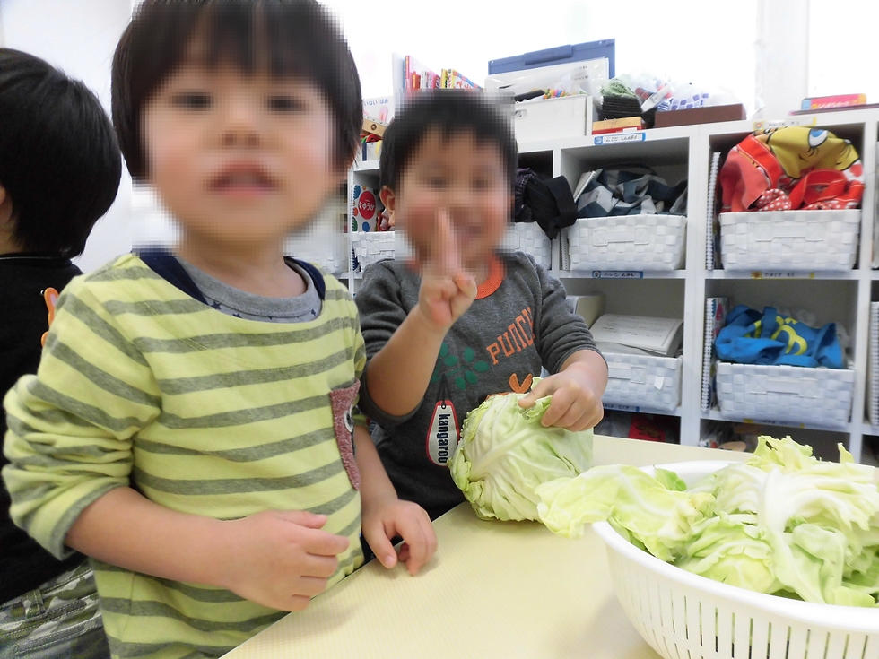 この日は「キャベツの皮むき」をしました。子天使ちゃん達に人気の食育なんですね〜(^-^)。皮むきが終わったら、「せんせ〜、次はいつキャベツの皮むきするの〜?」ですって(笑)。