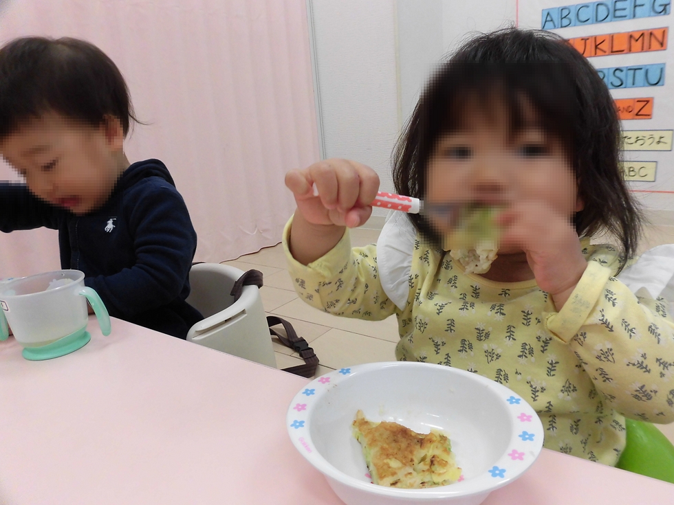 調理師さんが、むいたキャベツでキャベツ焼きを作ってくれました(右下写真)(^-^)。自分たちでむいたキャベツ、おいしいね〜(^o^)。