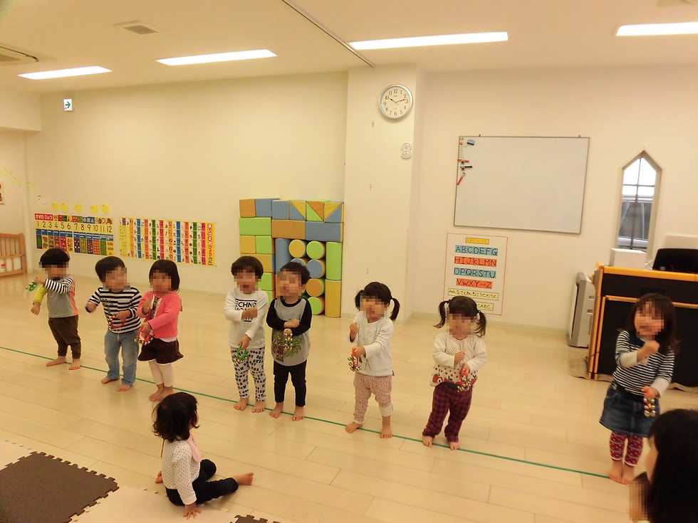 右下の写真はハンドベル・鈴 を使ってリズム遊び「シャンカ、シャンカ、シャン、シャン♪」(^-^)。