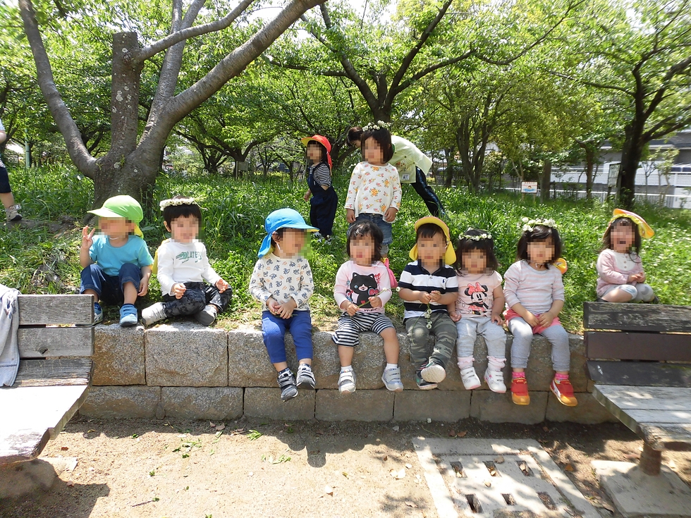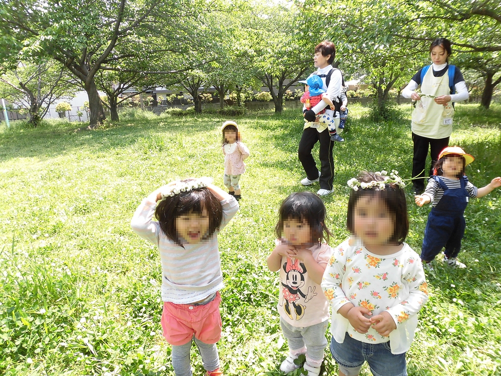 緑がすごくきれいです!子天使ちゃん達、いい気持ち〜(^-^)。白爪草の冠、可愛いっ!(^o^)。