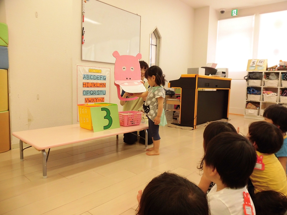 先生から示された数字ボードの数だけカバさんにエサをあげます。間違ったっていいんですよ(^-^)、楽しければいつの間にか覚えちゃいます(^-^)。