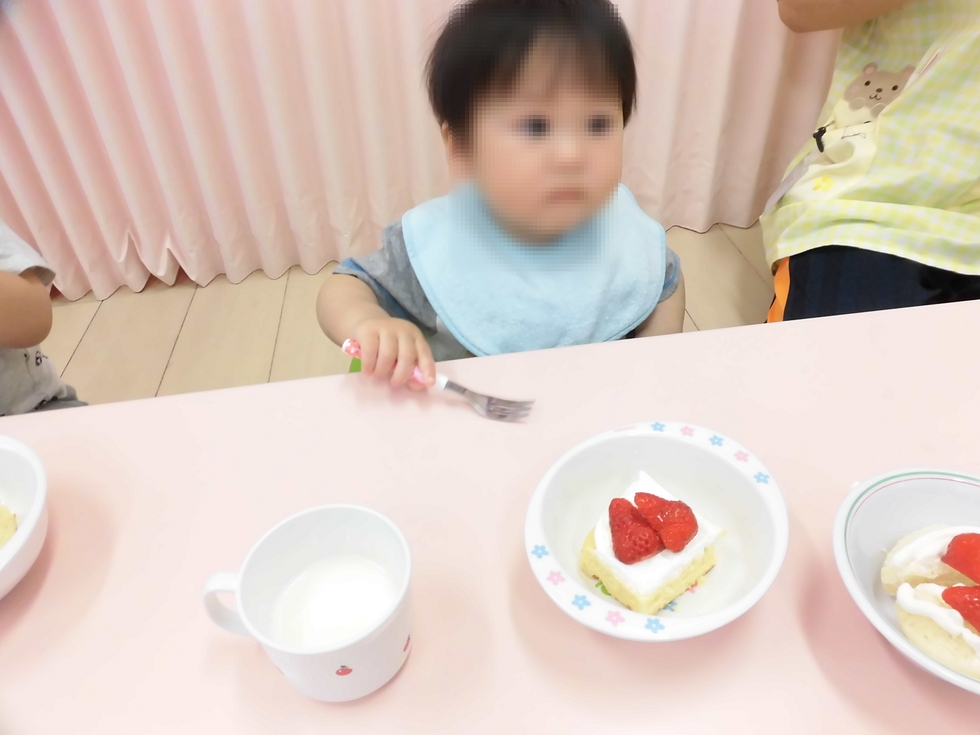 出し物の後は、こちらも恒例〜給食士さんの手作りイチゴのショートケーキ、牛乳でカンパーイ!