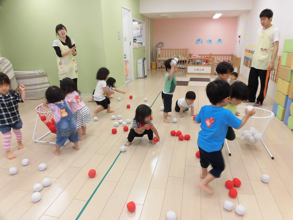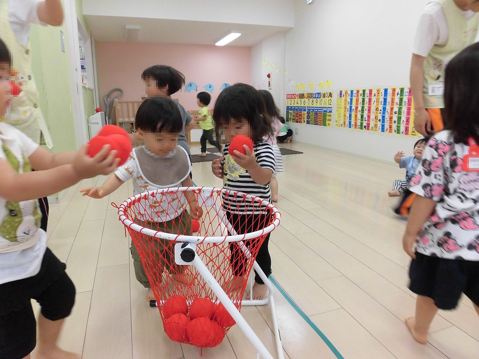今日は雨でお外に行けなかったので、玉入れ競争で発散です(^o^)。