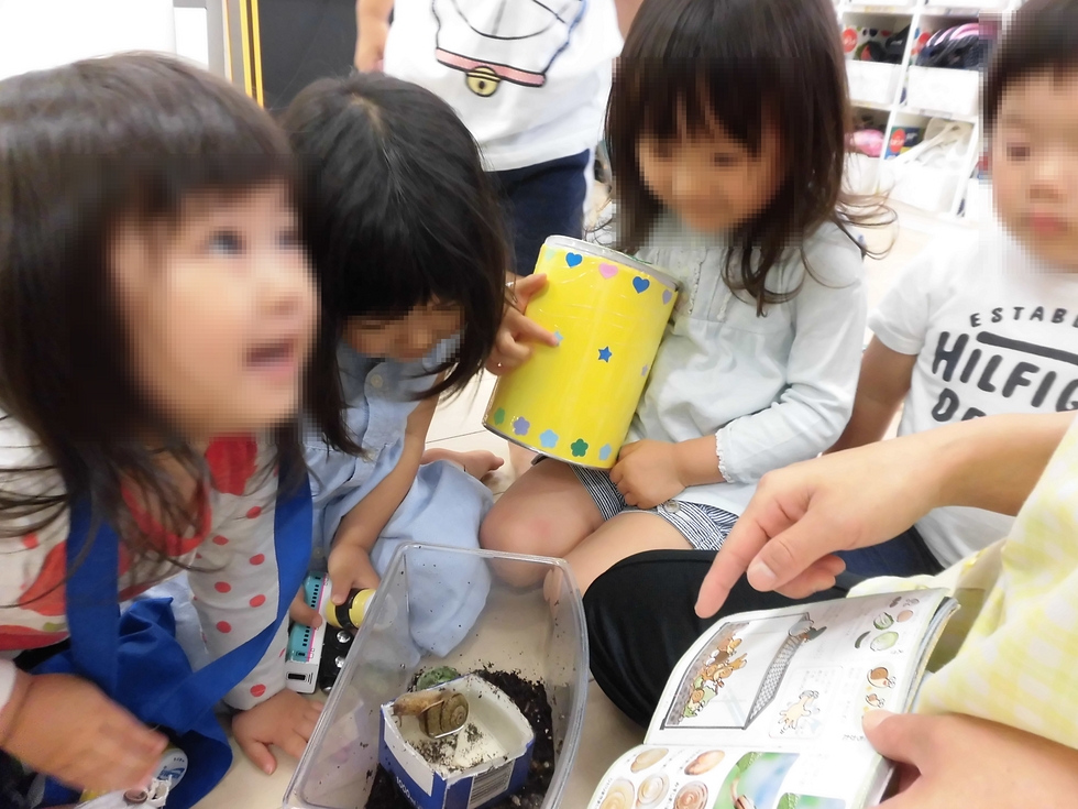 実はこのカタツムリ一昨年の6月に送り迎えの保護者の車のボンネットにくっついていたんですよ〜、それで園のペットに(^-^)。名前は「ツムリン」一昨年の赤組さんがつけました。