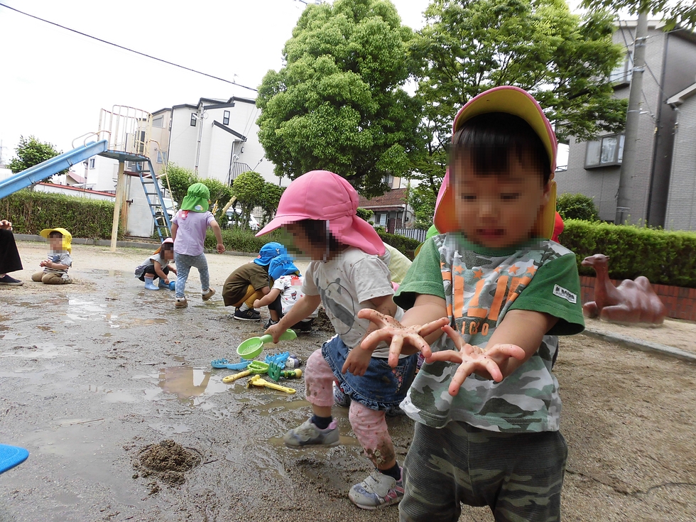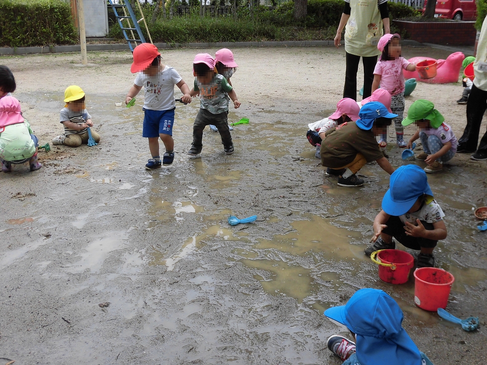 「これこれ泥を食べようとしてはいけません・汗」「冷たぁい〜、泥を投げたのは誰ですかぁぁ」、先生達は大忙し!(笑)
